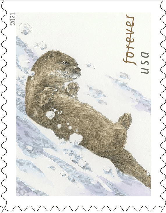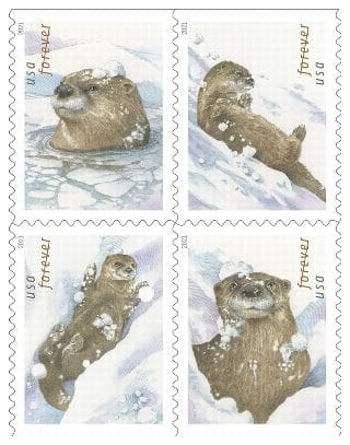 Featuring four designs of otters in winter landscapes.