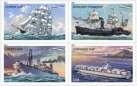 Featuring the U.S. Merchant Marine four types of vessels: clipper ships, auxiliary steamships, liberty ships, and con­tainer ships.