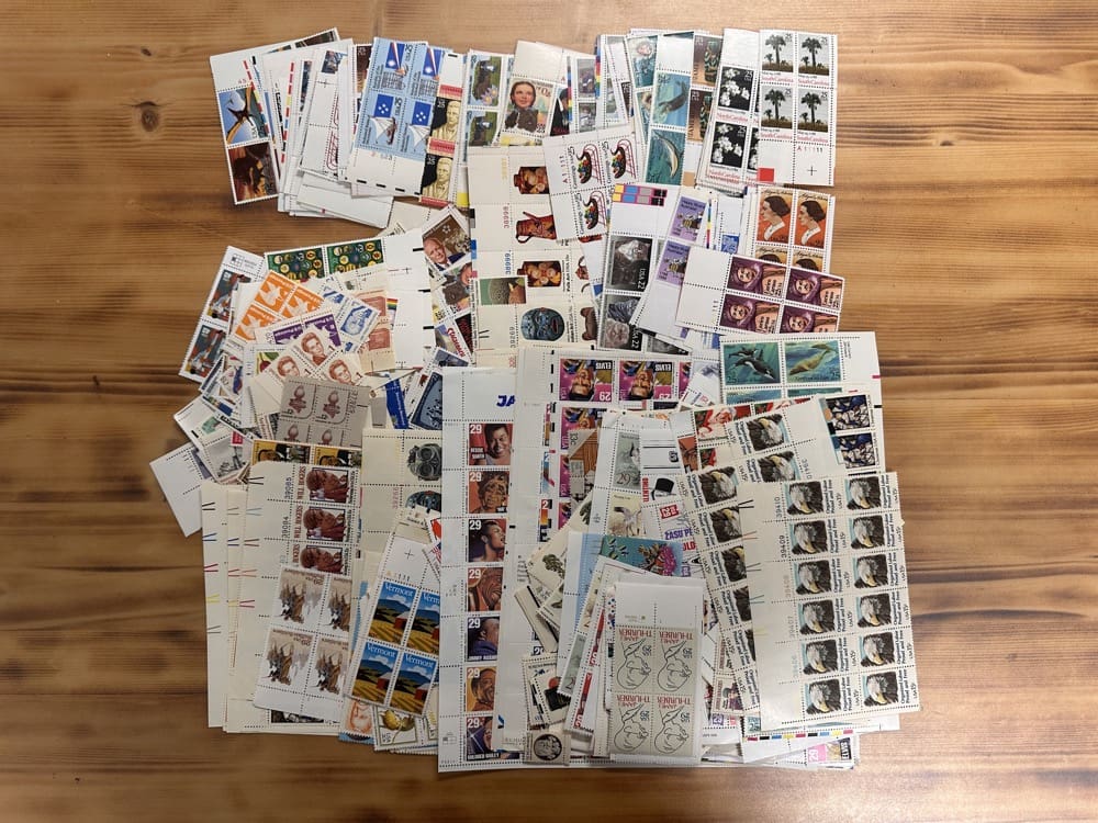 Stamp value denominations are all below the current First-Class rate, and may be self-adhesive or moisture activated, unless otherwise noted in the product title or description below.