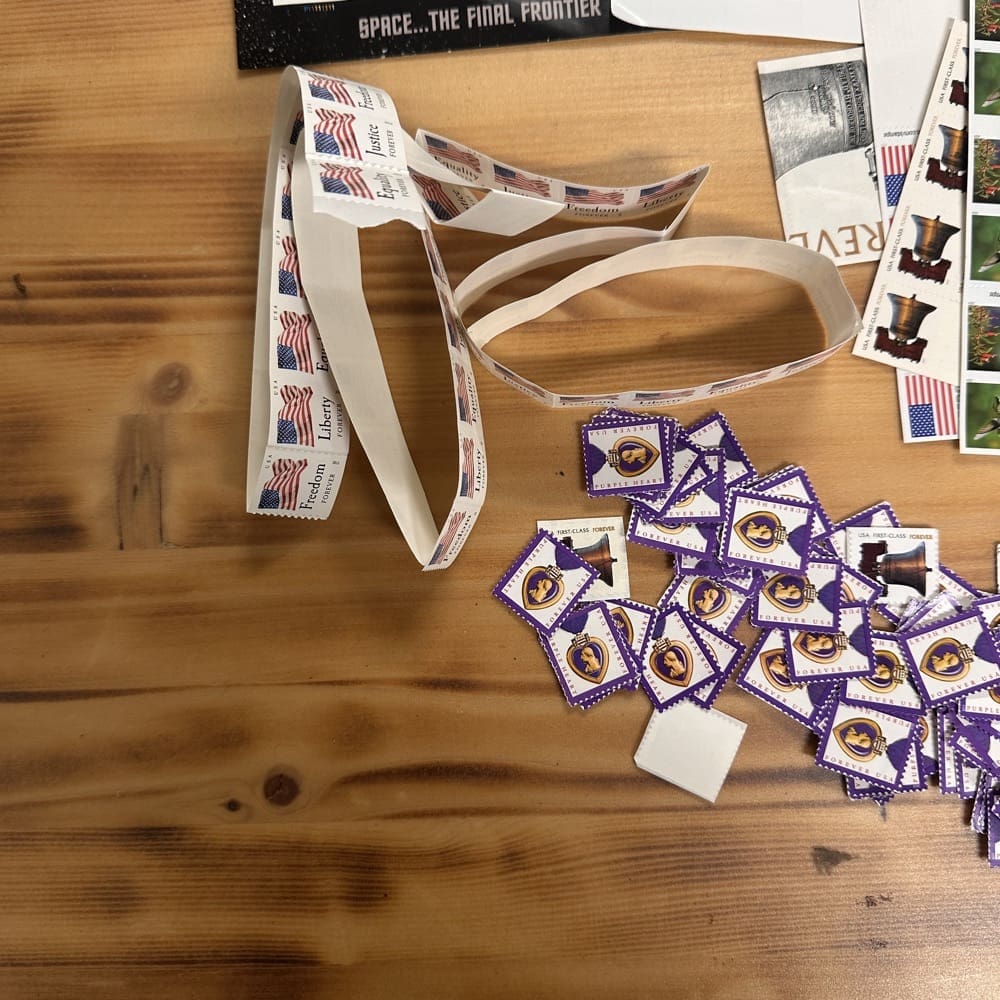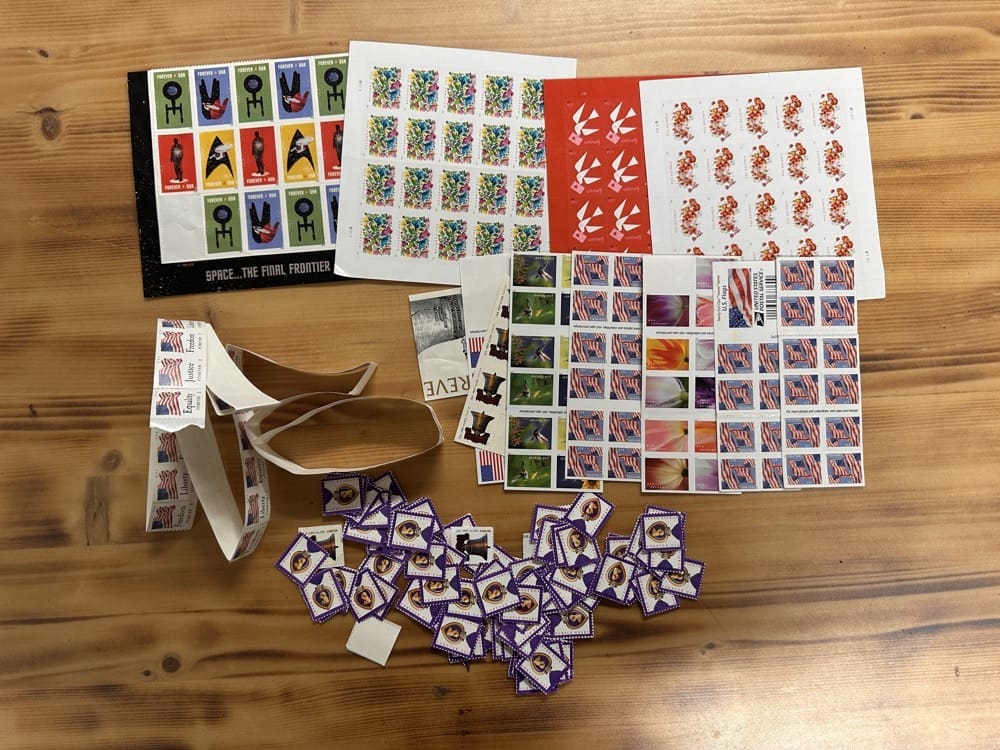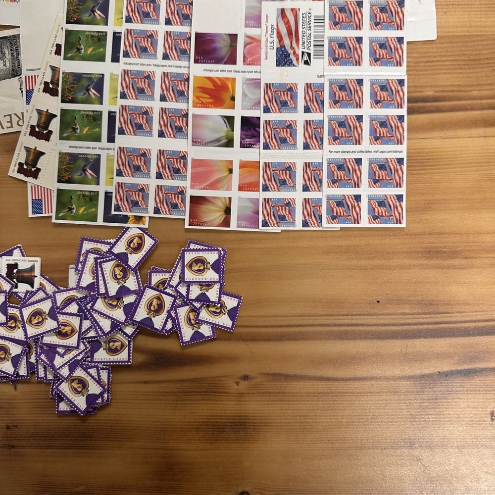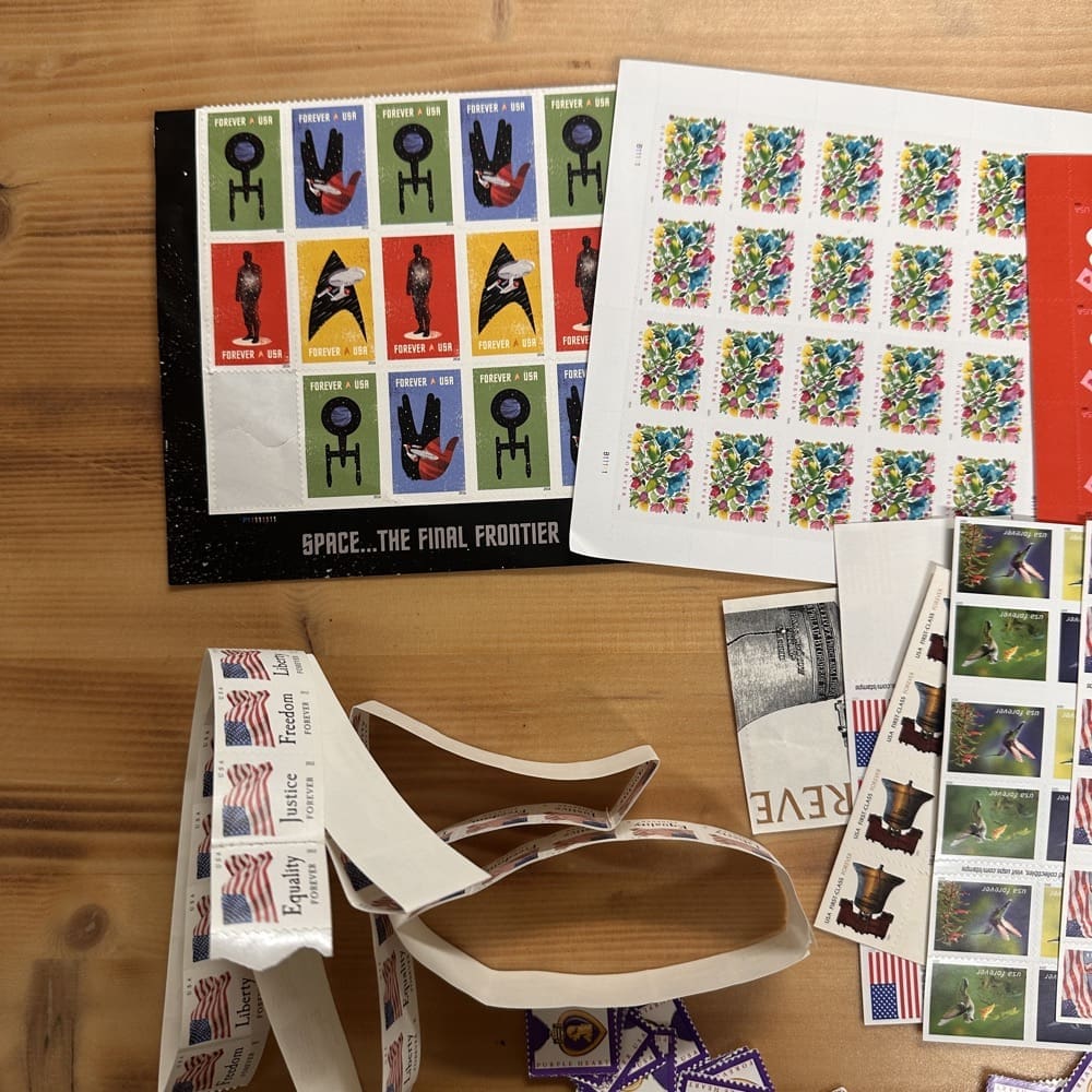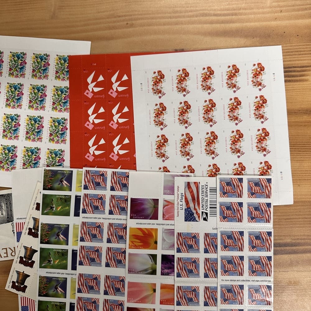Lot of First-Class Forever® stamps in various designs.