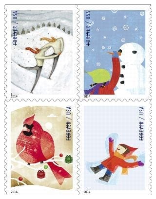 Four of the winter season’s favorite activities ice-skating, making snow angels, building snowmen, and bird-watching.