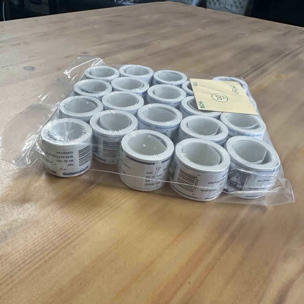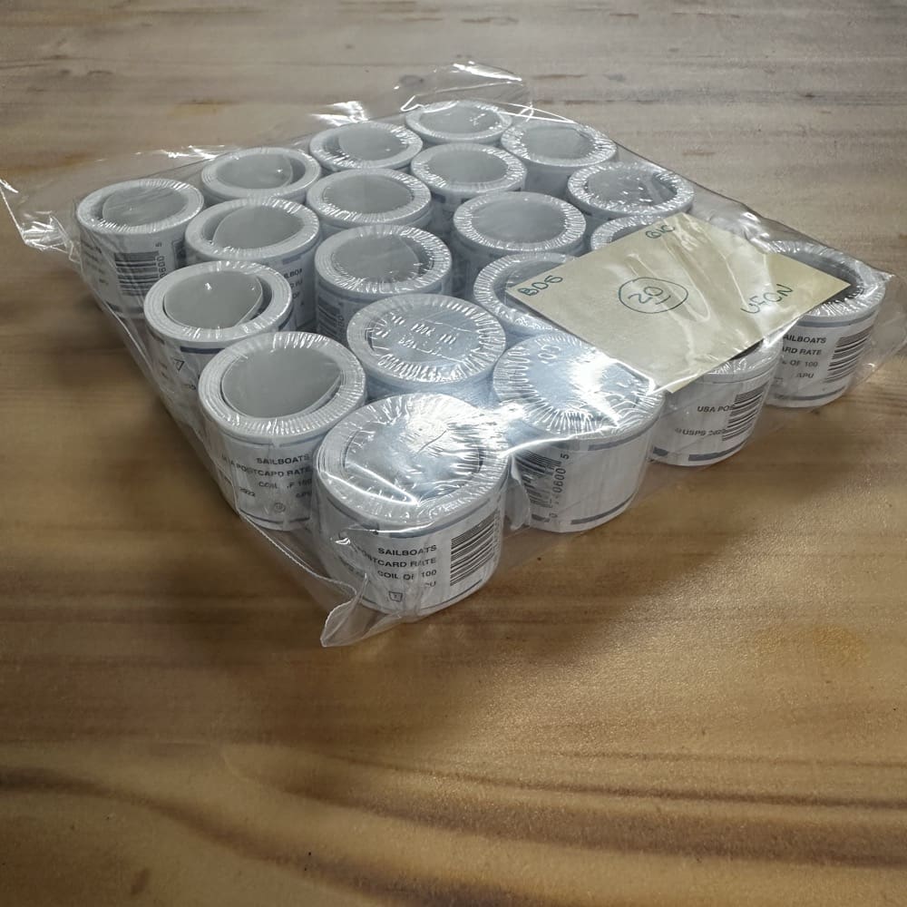 Stamp value denominations are all below the current First-Class rate, and may be self-adhesive or moisture activated, unless otherwise noted in the product title or description below.