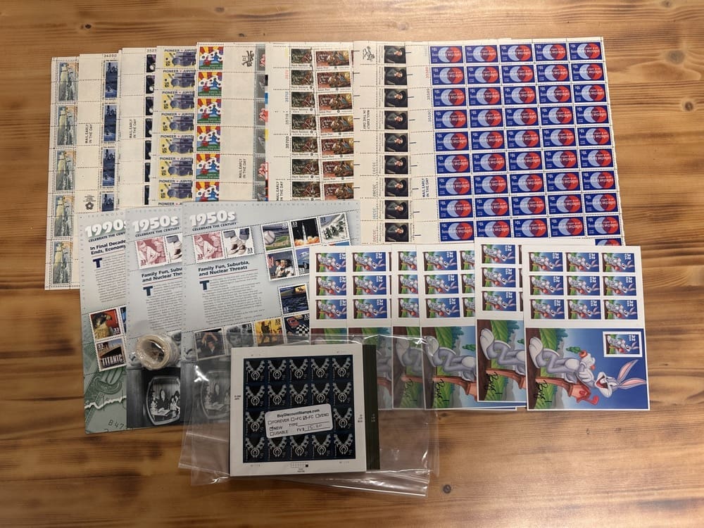 Stamp value denominations are all below the current First-Class rate, and may be self-adhesive or moisture activated, unless otherwise noted in the product title or description below.