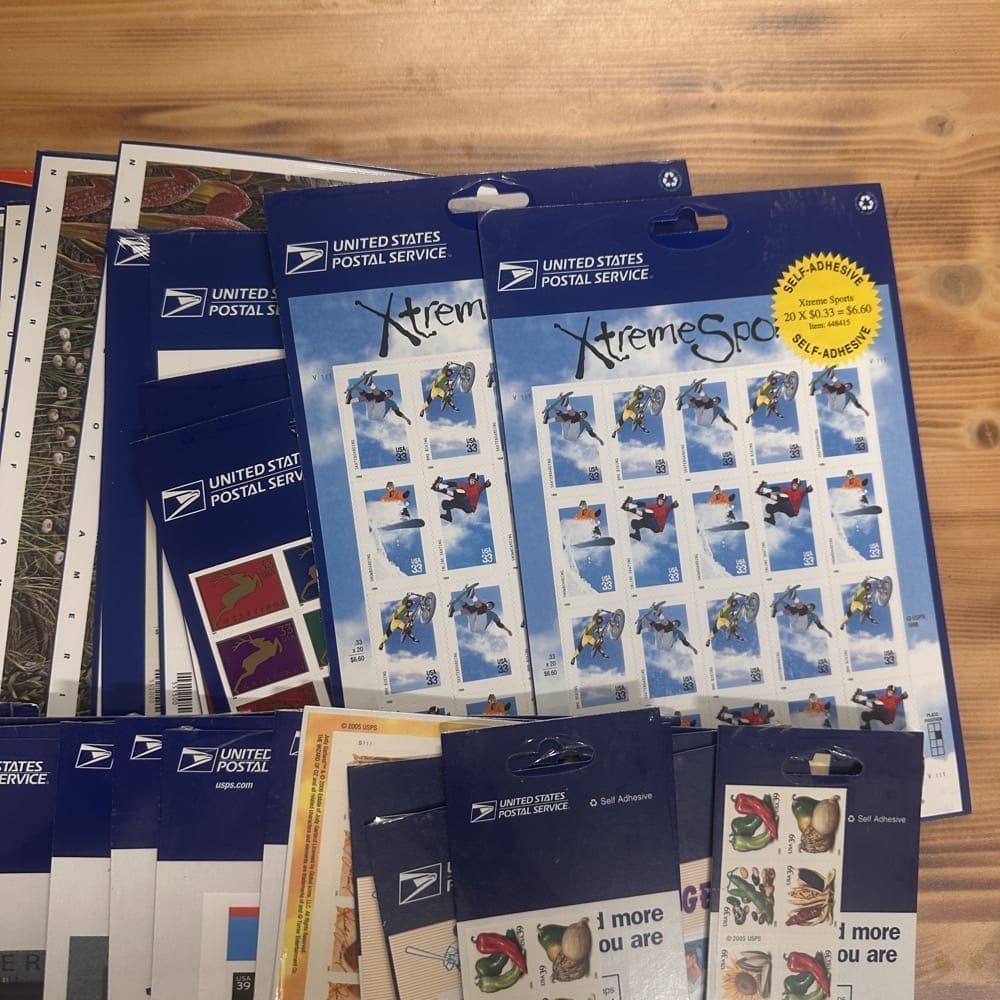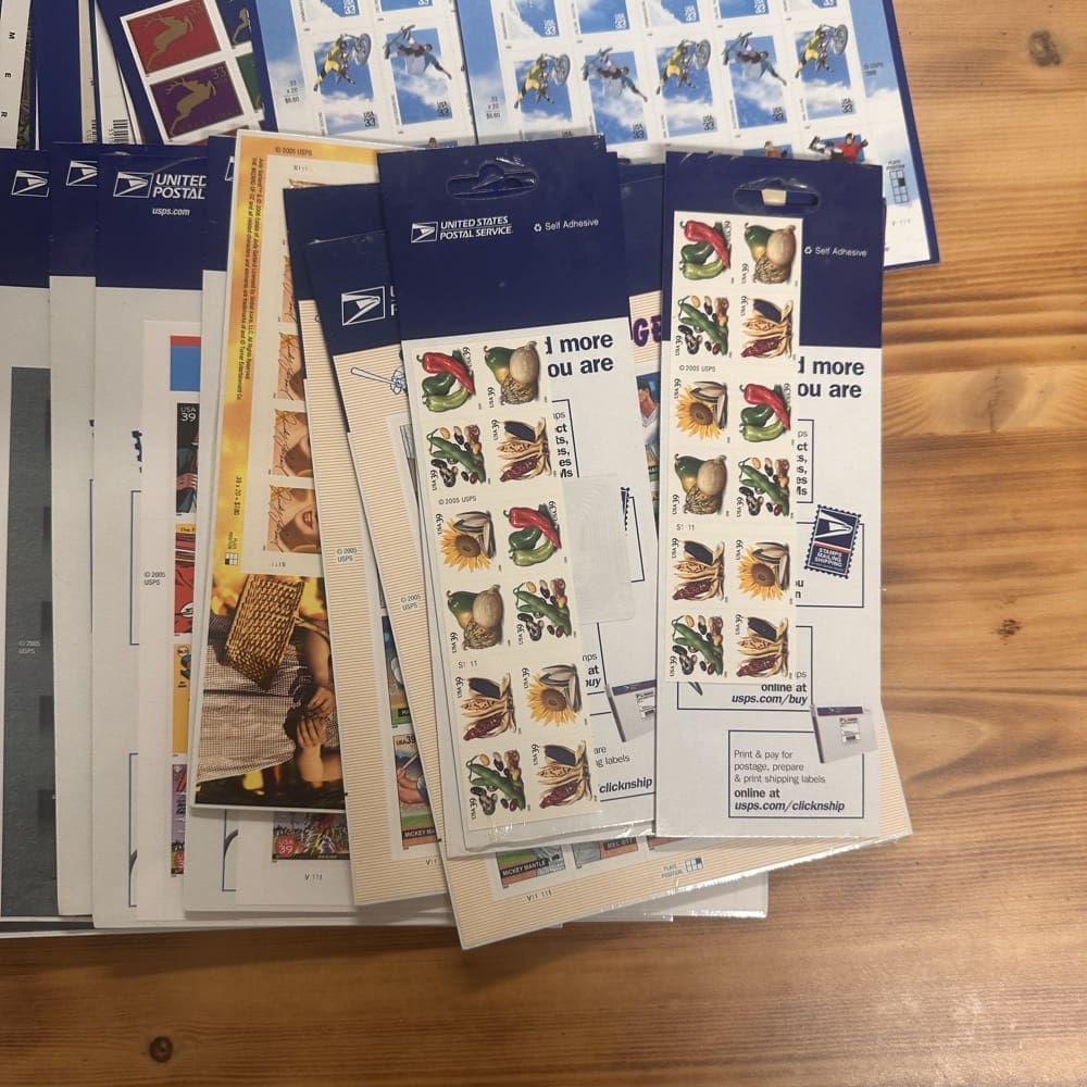 Stamp value denominations are all below the current First-Class rate, and may be self-adhesive or moisture activated, unless otherwise noted in the product title or description below.