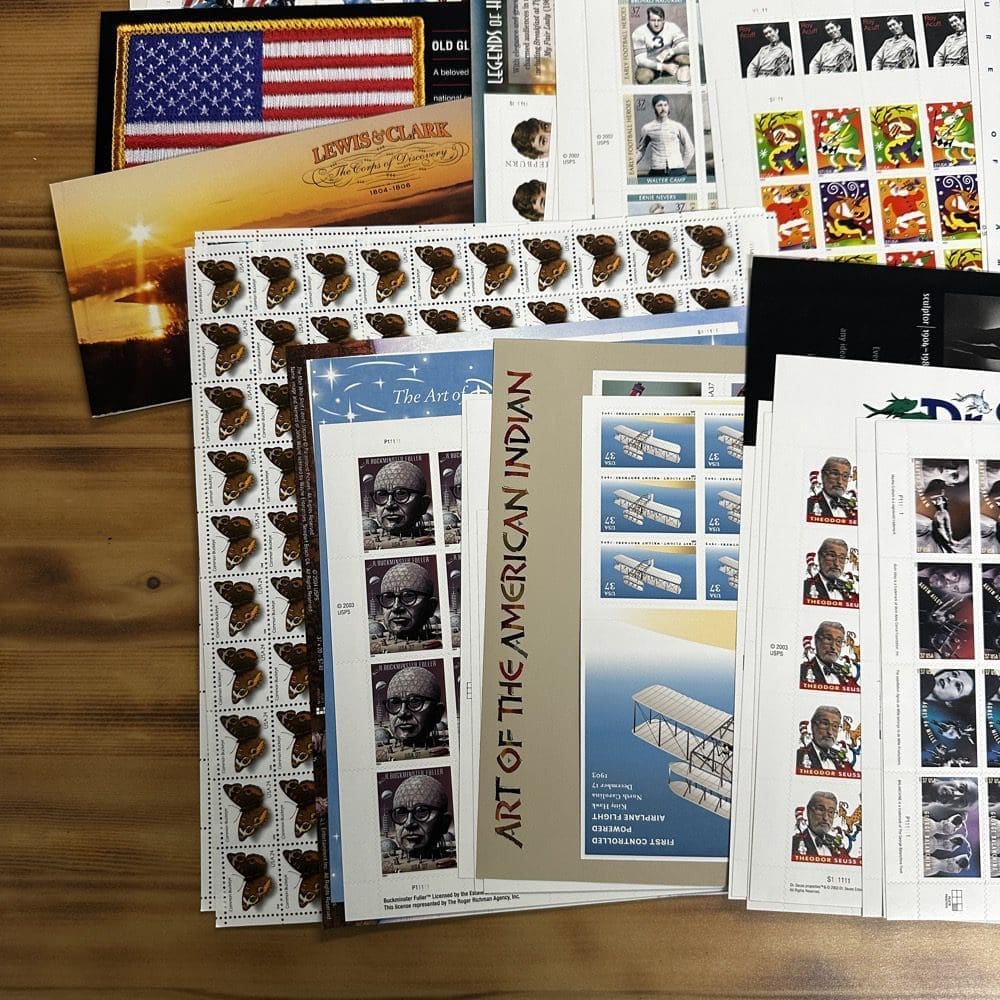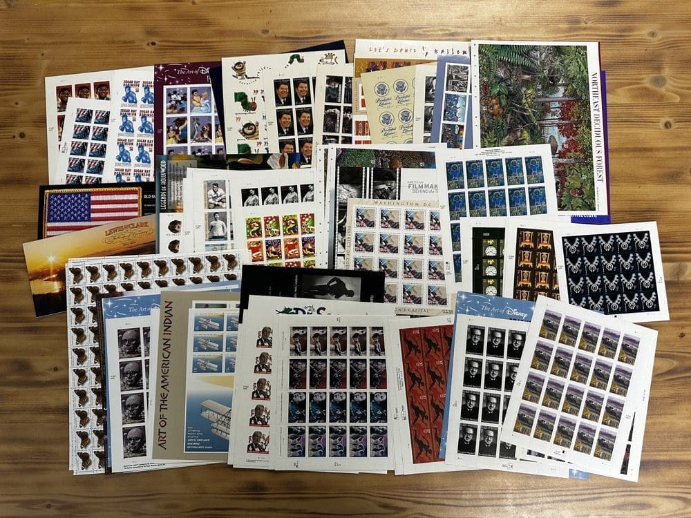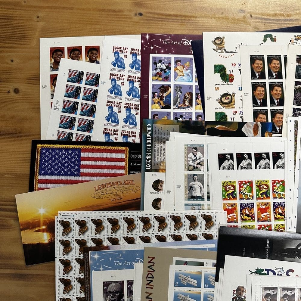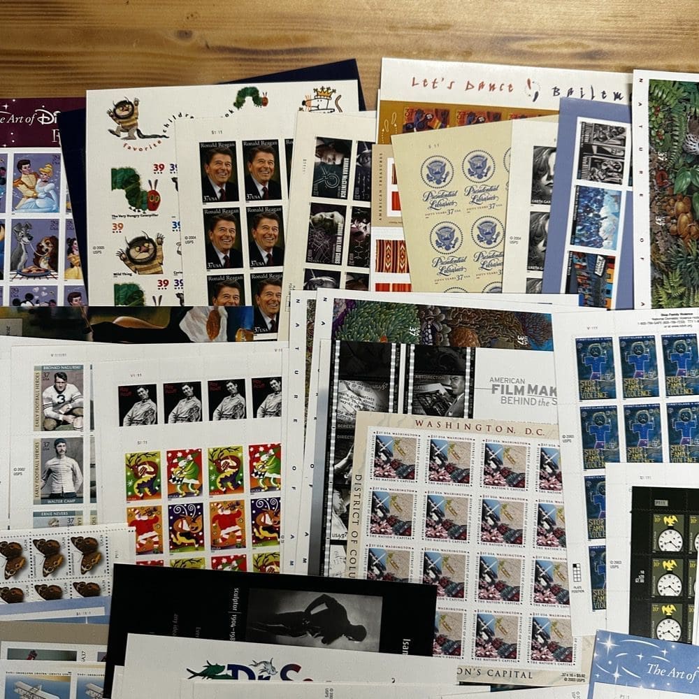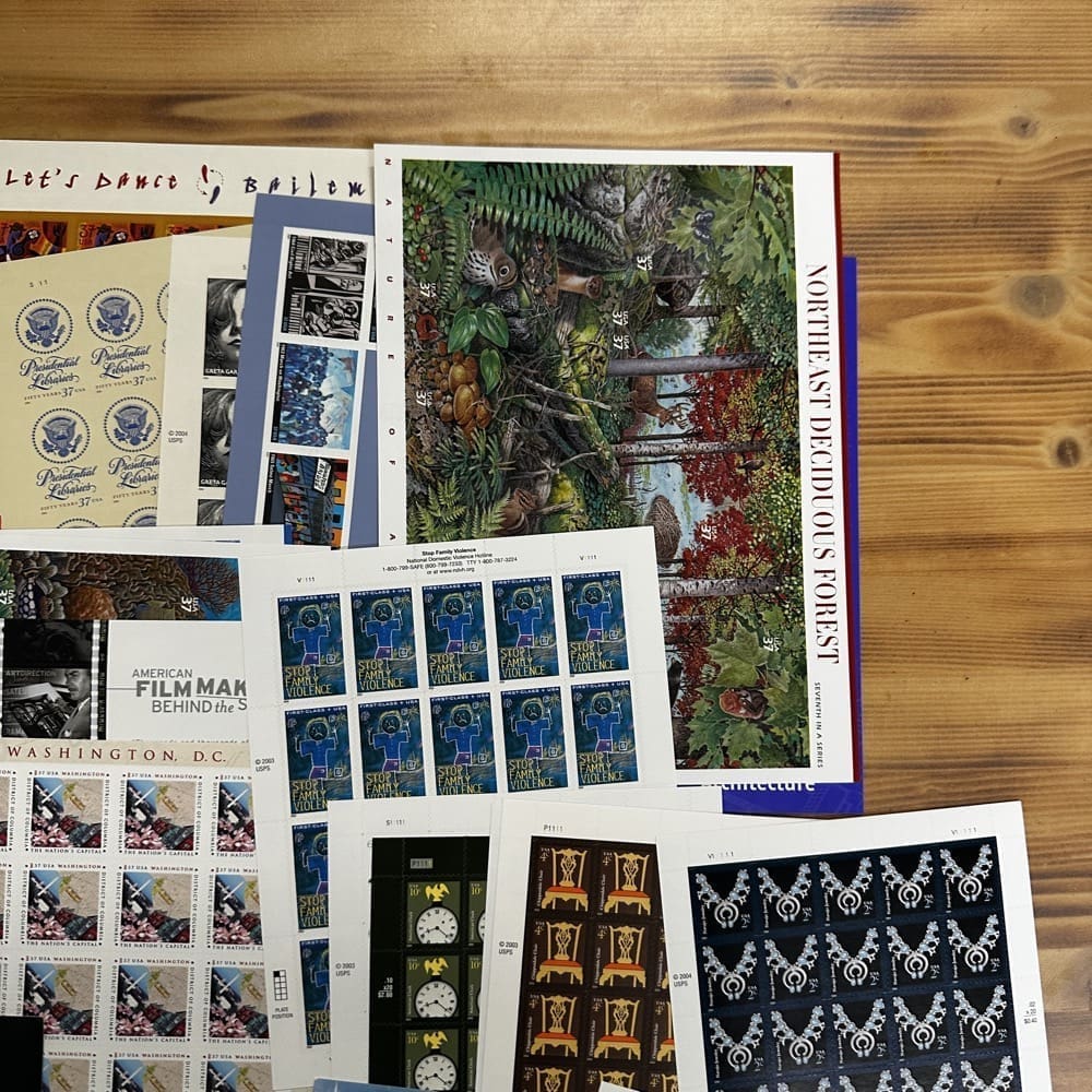Stamp value denominations are all below the current First-Class rate, and may be self-adhesive or moisture activated, unless otherwise noted in the product title or description below.