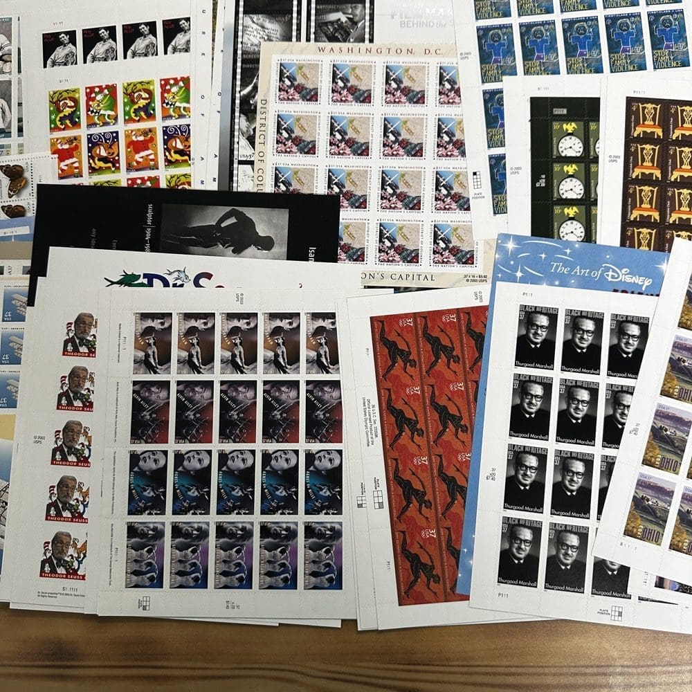 Lot of low-denomination postage stamps with values under the current First-Class rate.