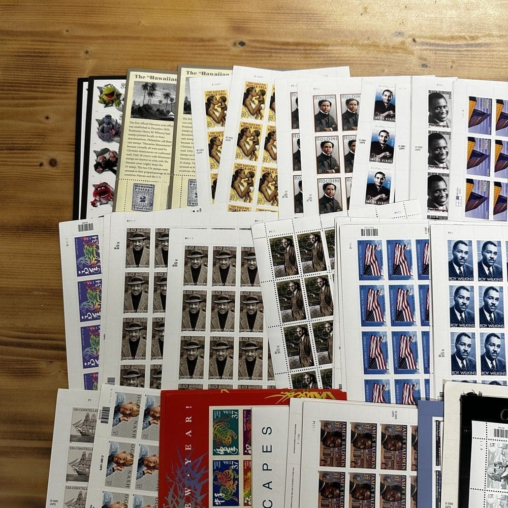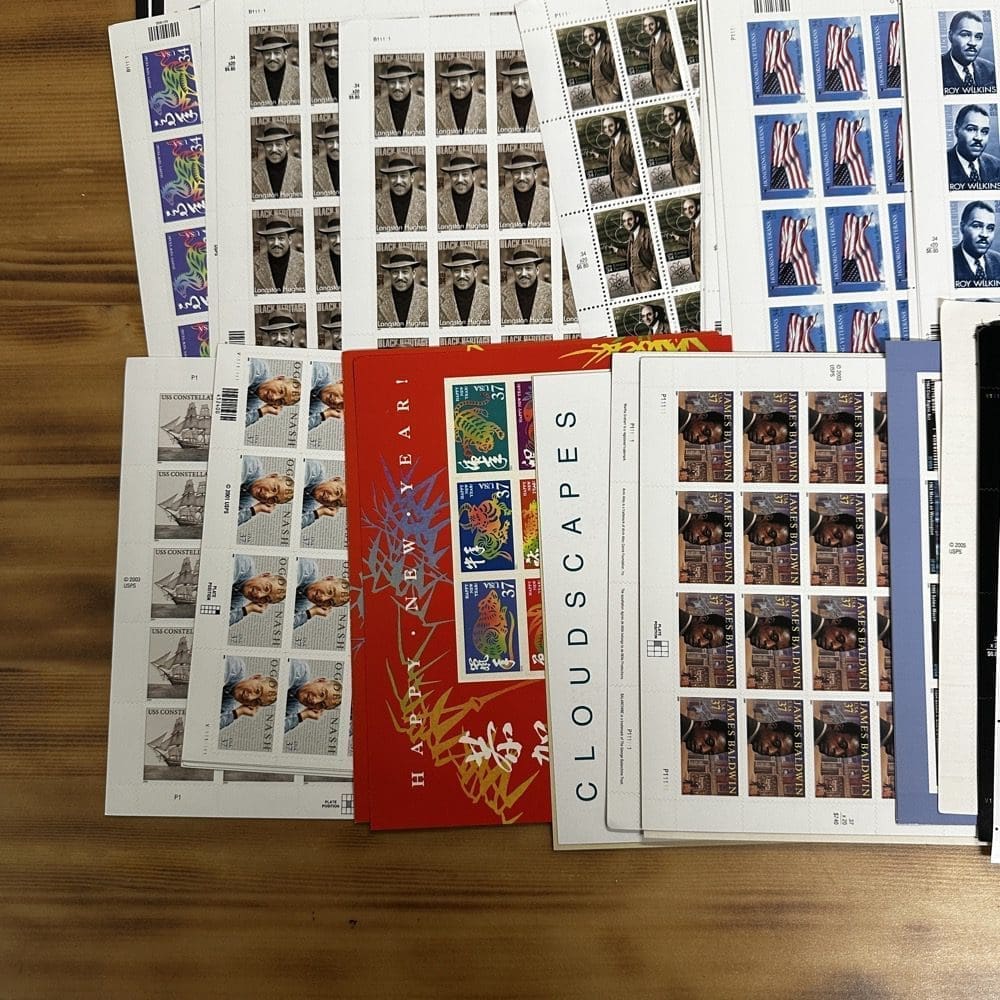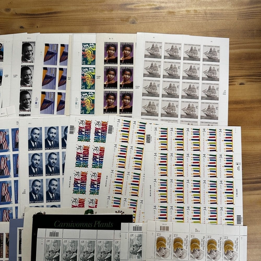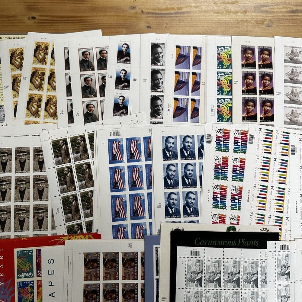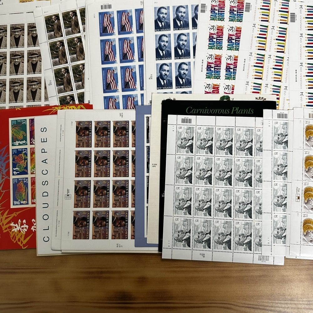 Stamp value denominations are all below the current First-Class rate, and may be self-adhesive or moisture activated, unless otherwise noted in the product title or description below.