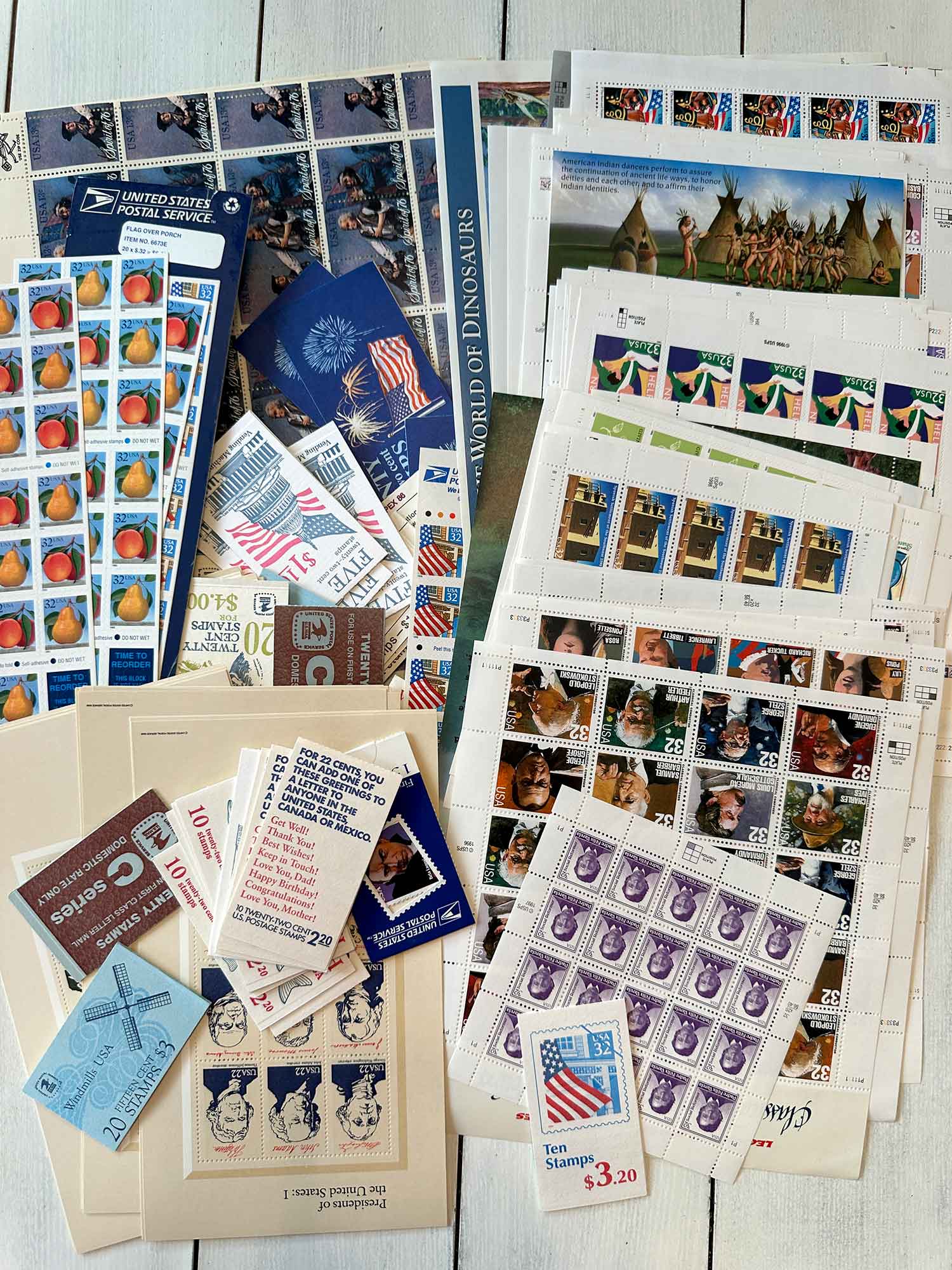 Stamp value denominations are all below the current First-Class rate, and may be self-adhesive or moisture activated, unless otherwise noted in the product title or description below.