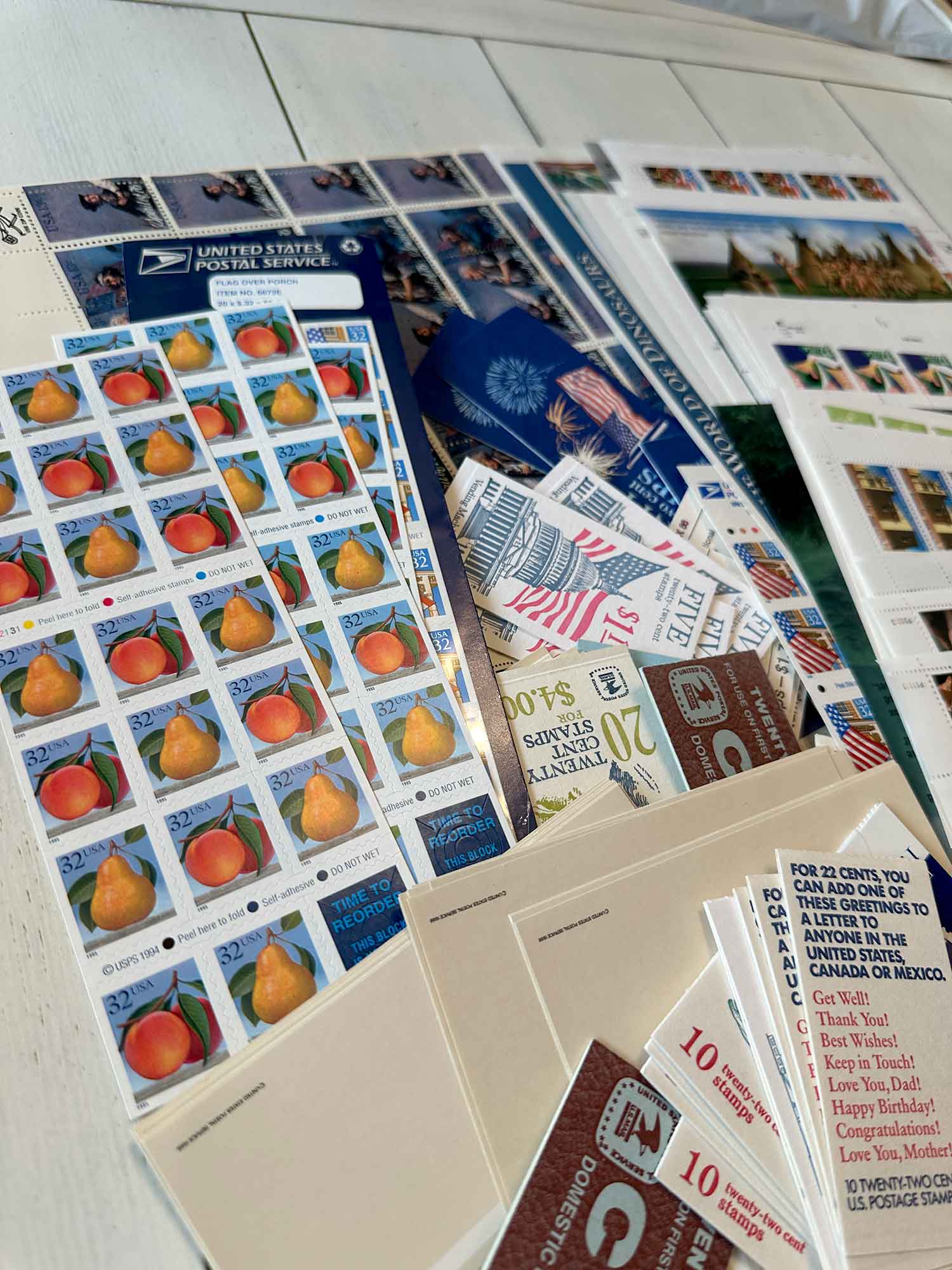 Lot of low-denomination postage stamps with values under the current First-Class rate.
