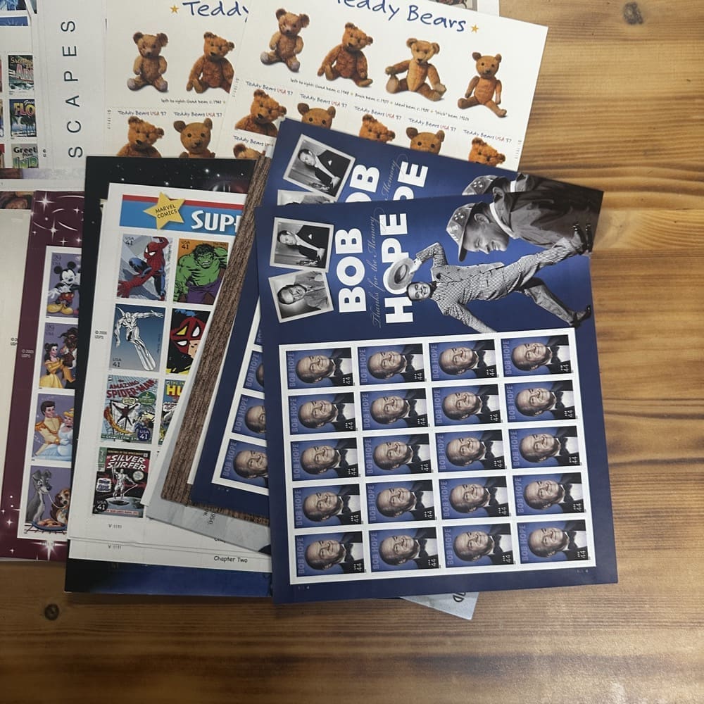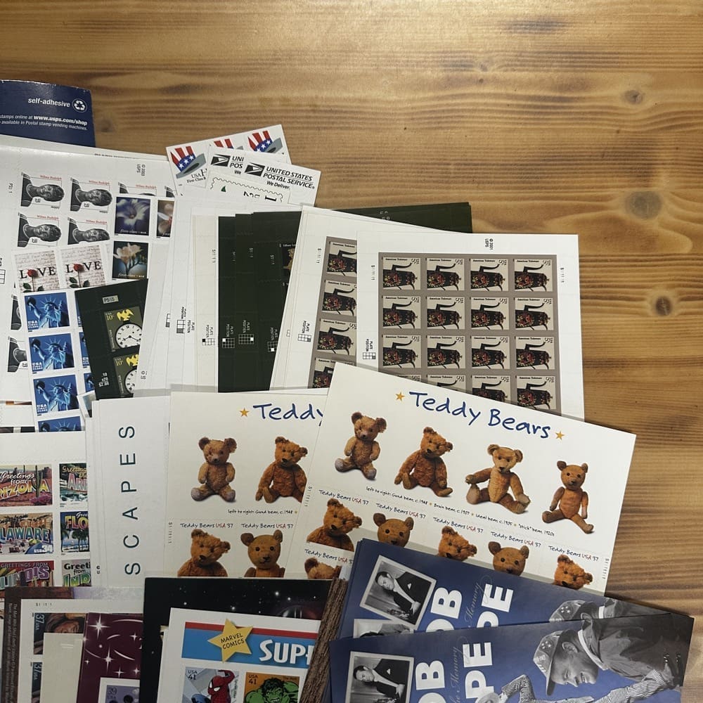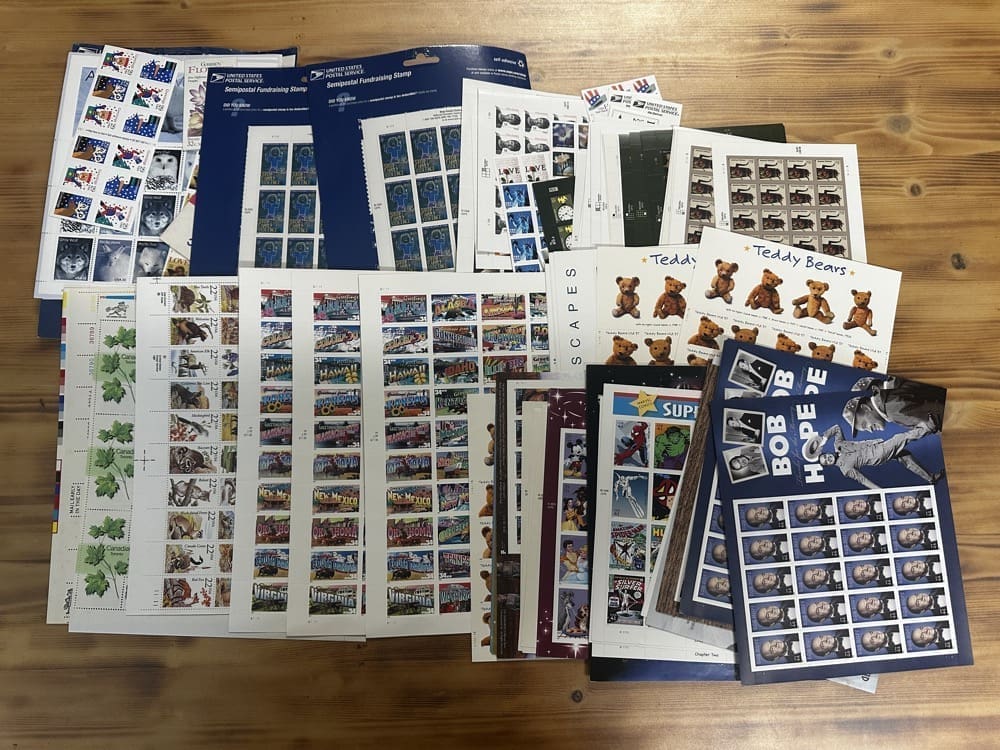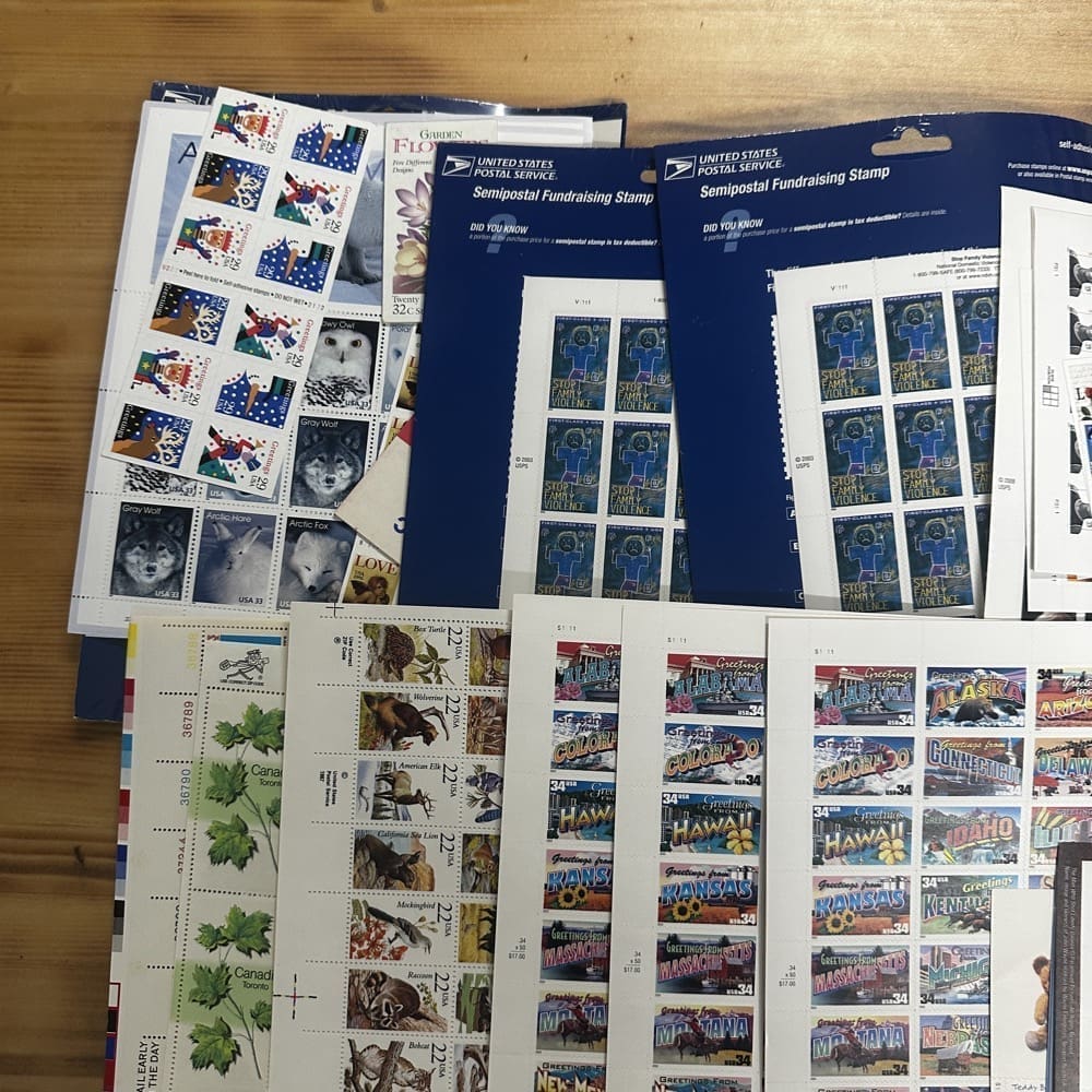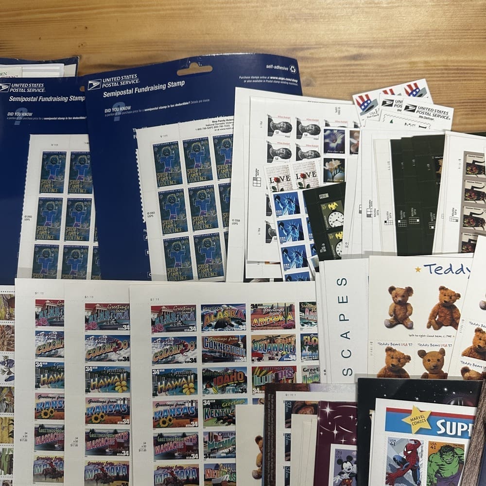 Stamp value denominations are all below the current First-Class rate, and may be self-adhesive or moisture activated, unless otherwise noted in the product title or description below.