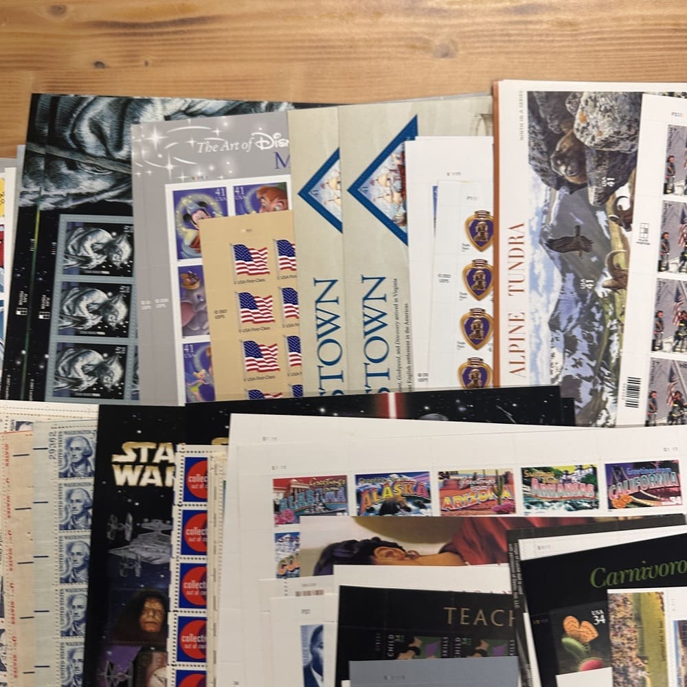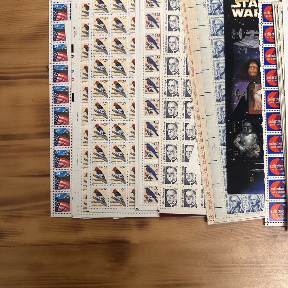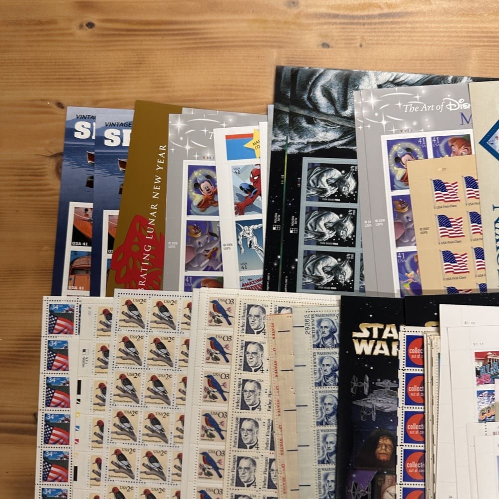 Stamp value denominations are all below the current First-Class rate, and may be self-adhesive or moisture activated, unless otherwise noted in the product title or description below.