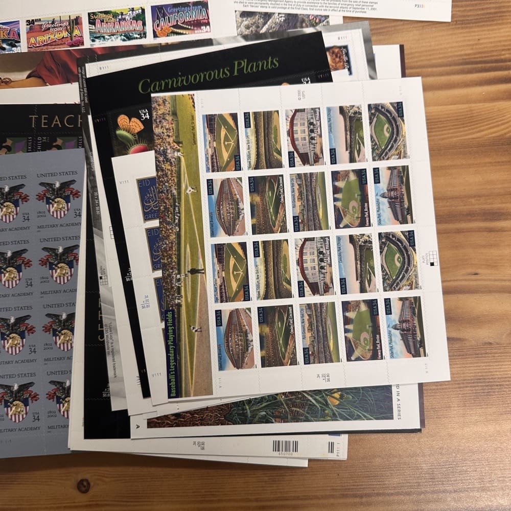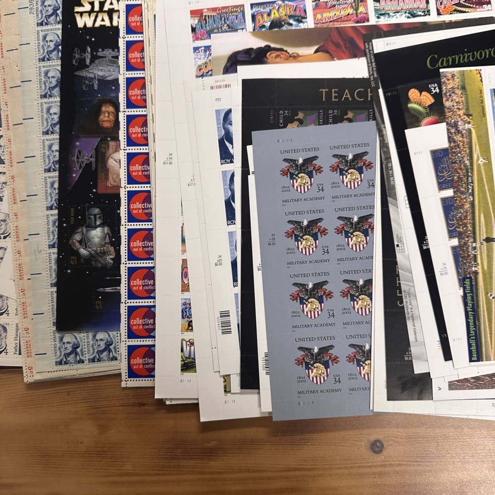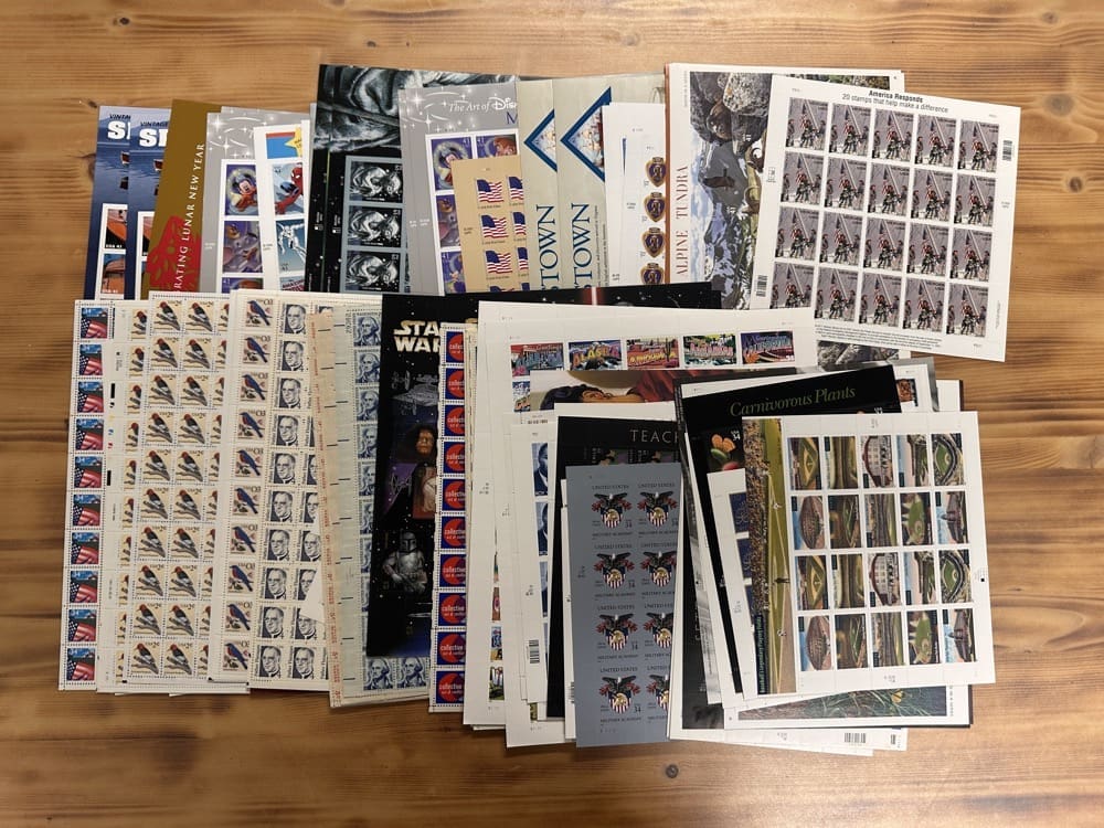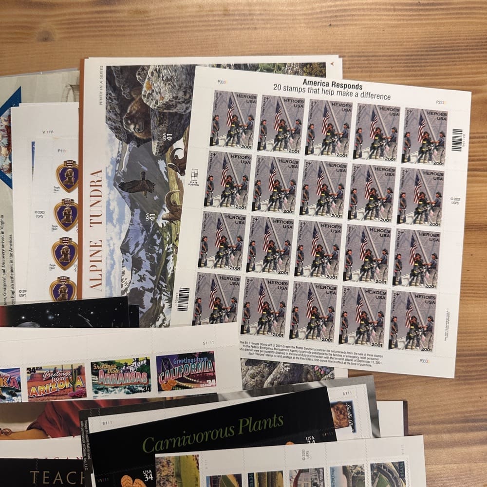Stamp value denominations are all below the current First-Class rate, and may be self-adhesive or moisture activated, unless otherwise noted in the product title or description below.