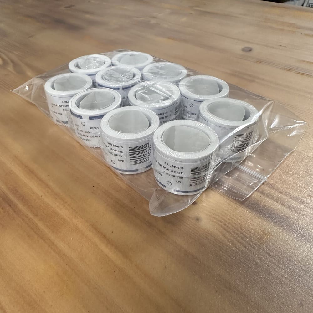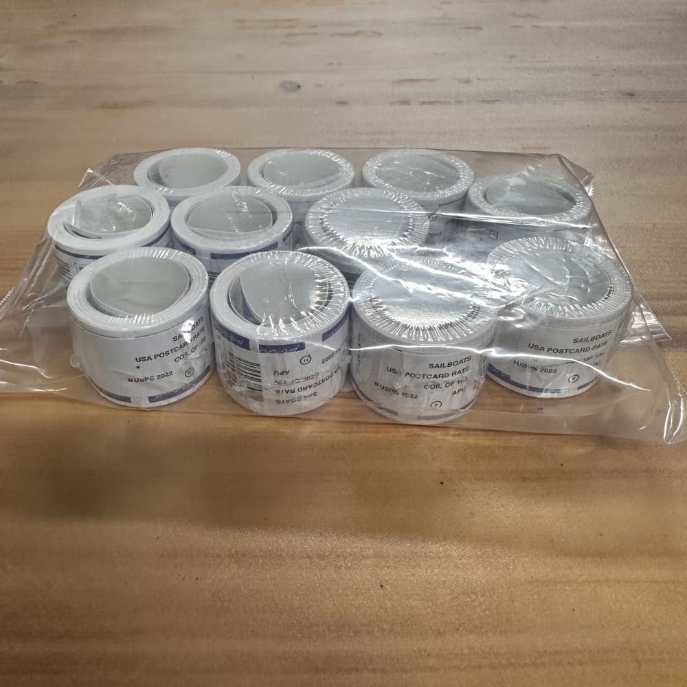 Stamp value denominations are all below the current First-Class rate, and may be self-adhesive or moisture activated, unless otherwise noted in the product title or description below.