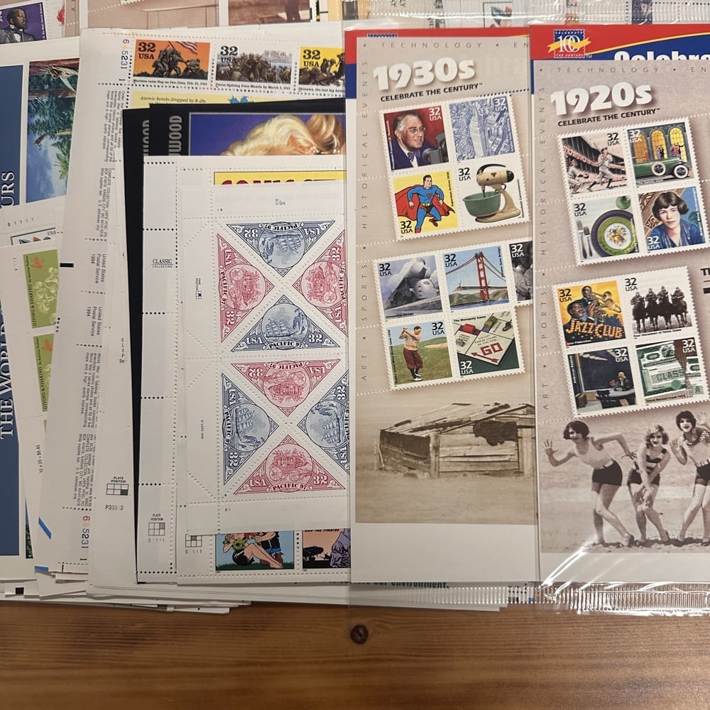 Stamp value denominations are all below the current First-Class rate, and may be self-adhesive or moisture activated, unless otherwise noted in the product title or description below.