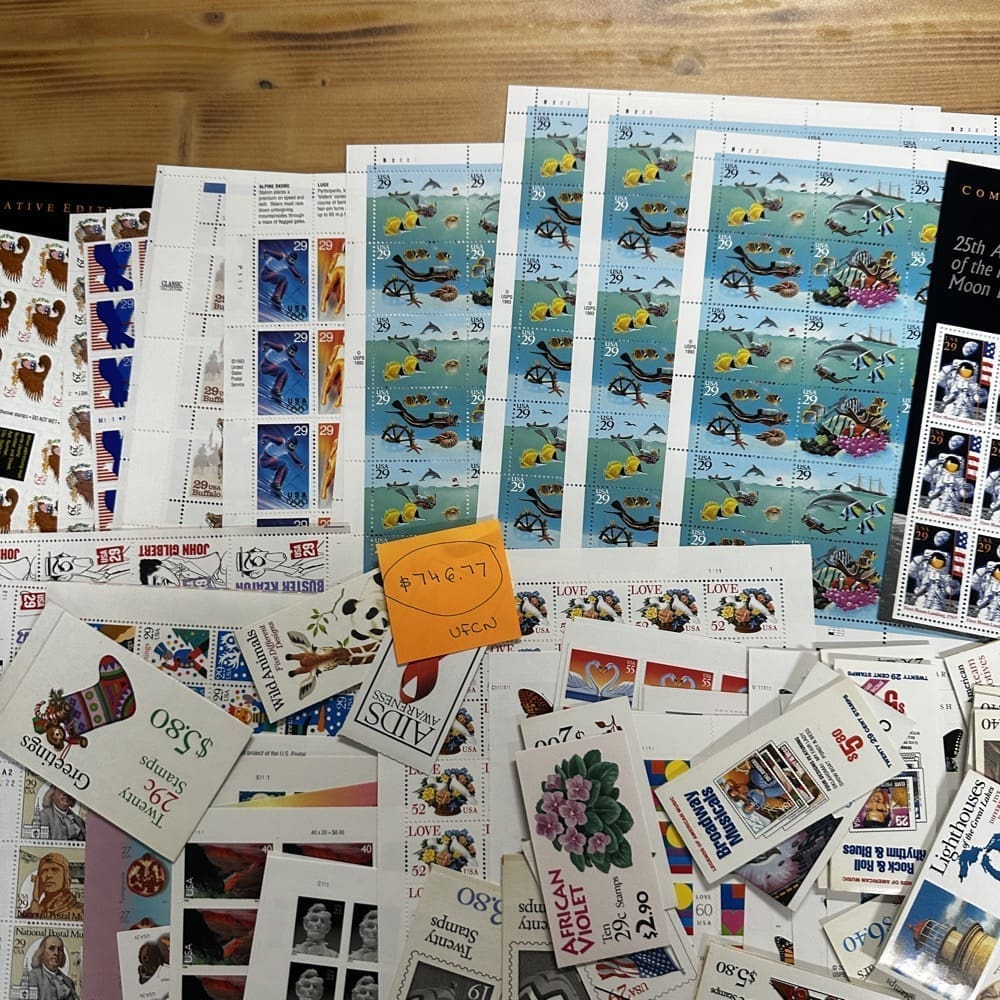 Stamp value denominations are all below the current First-Class rate, and may be self-adhesive or moisture activated, unless otherwise noted in the product title or description below.