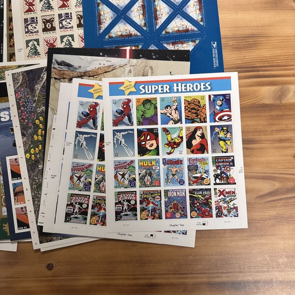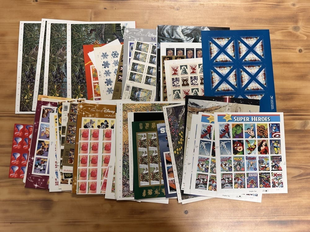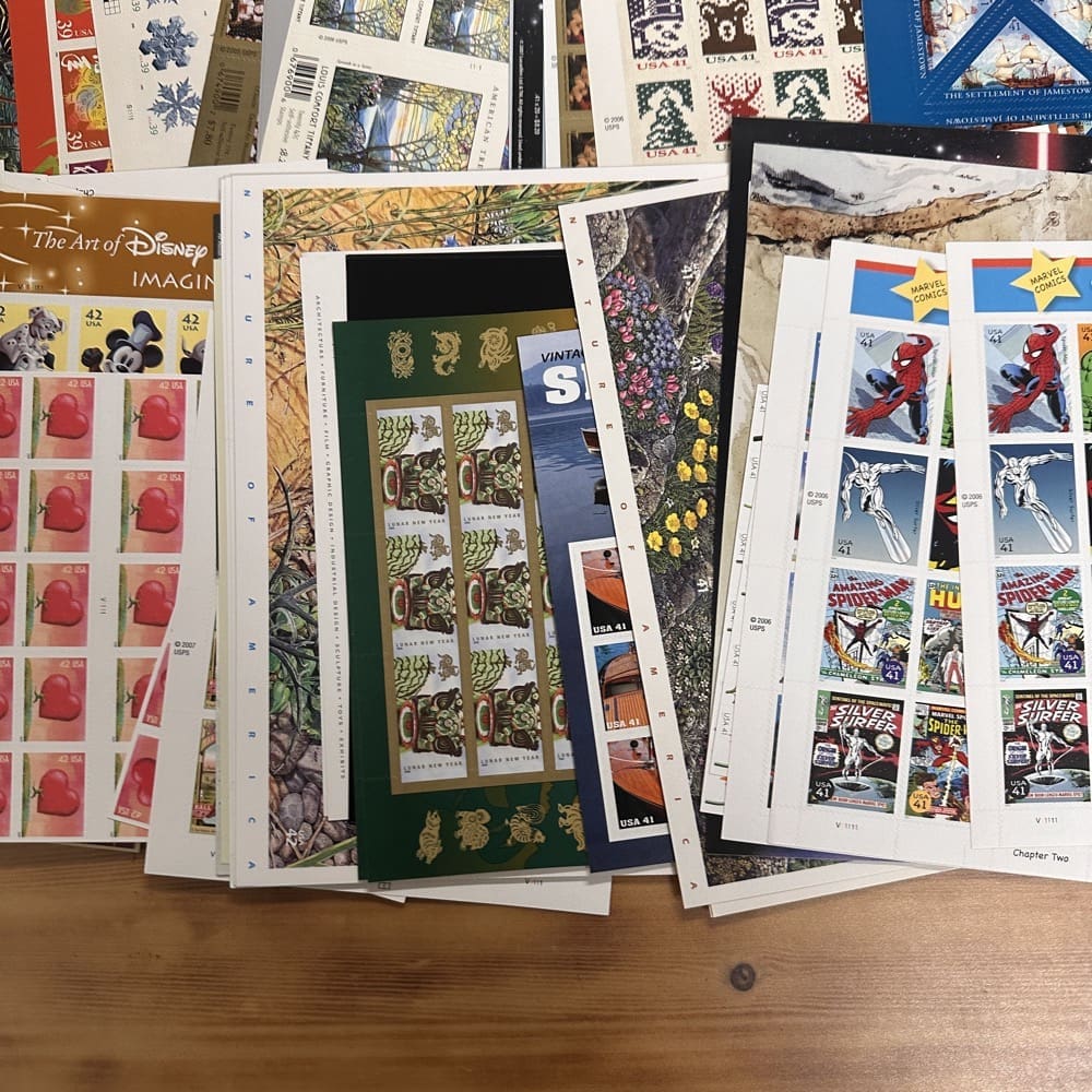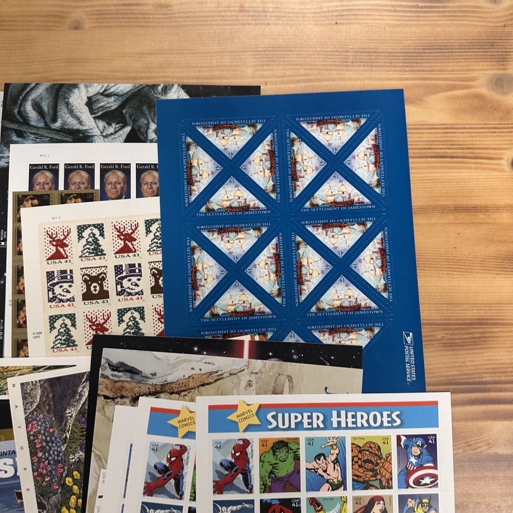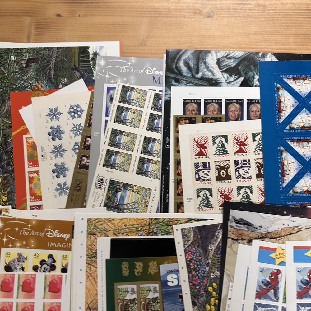 Stamp value denominations are all below the current First-Class rate, and may be self-adhesive or moisture activated, unless otherwise noted in the product title or description below.