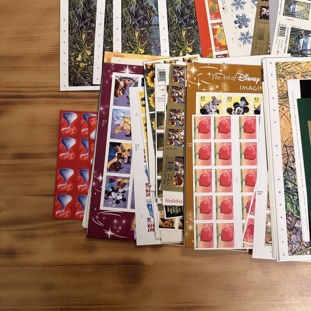 Lot of low-denomination postage stamps with values under the current First-Class rate.