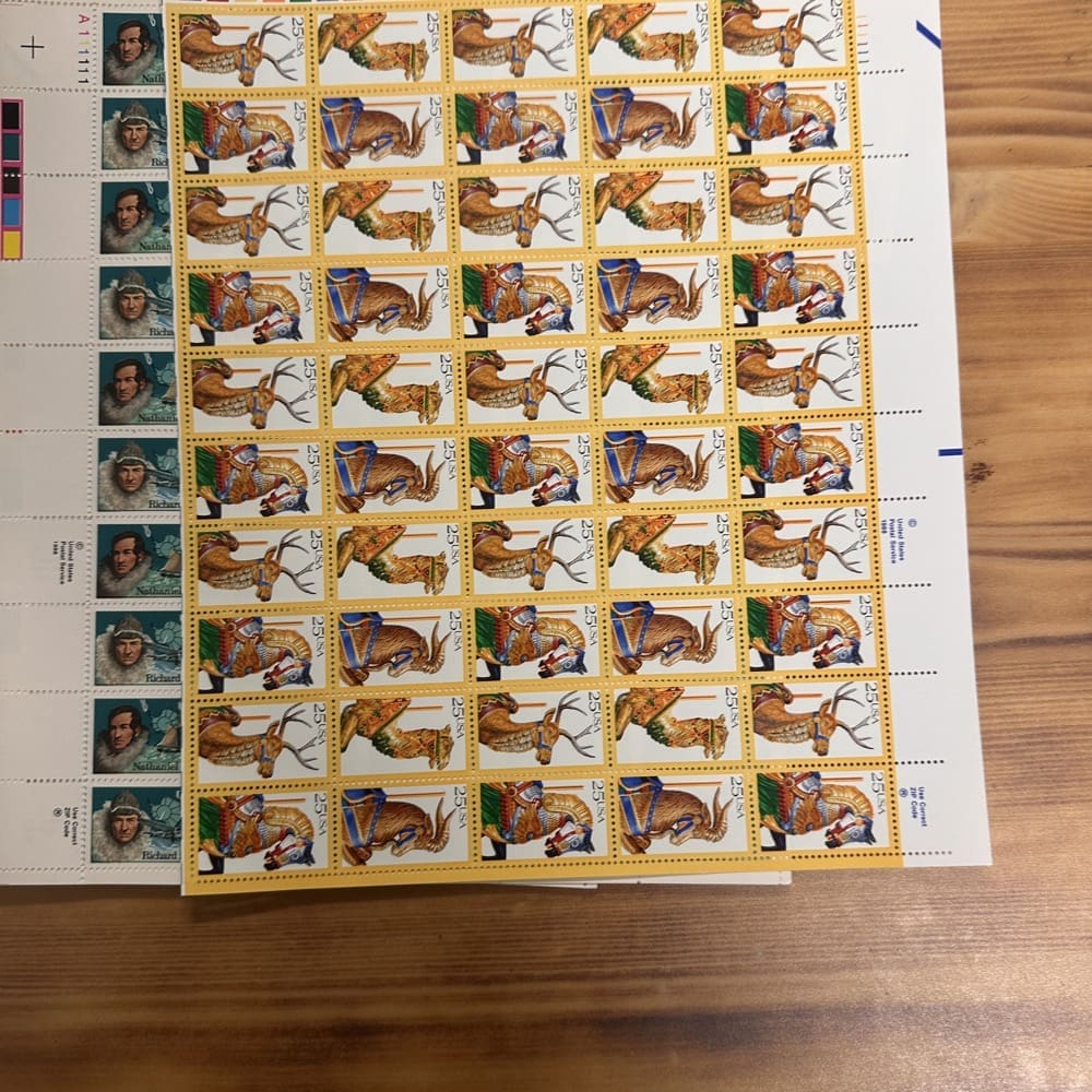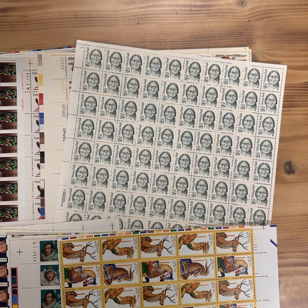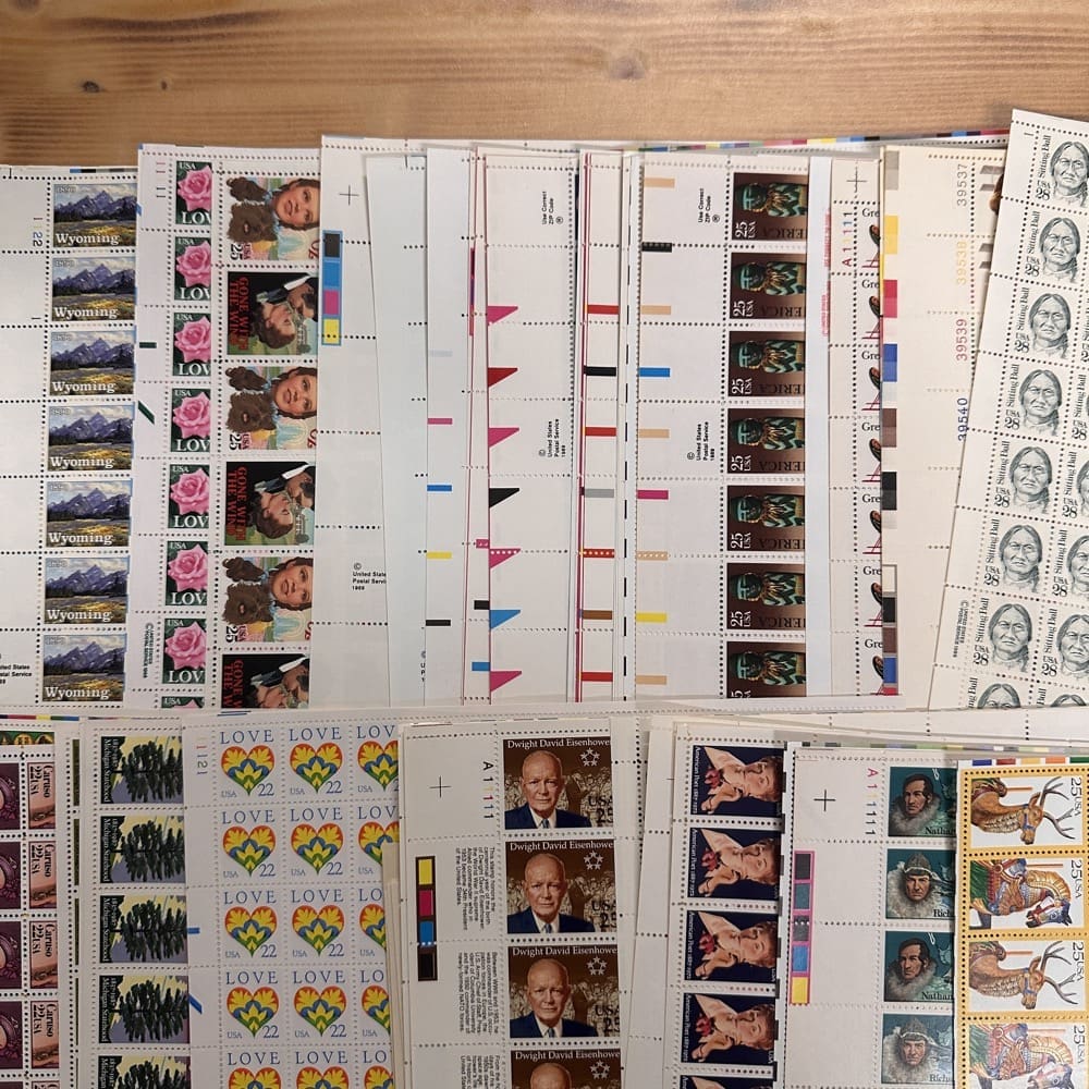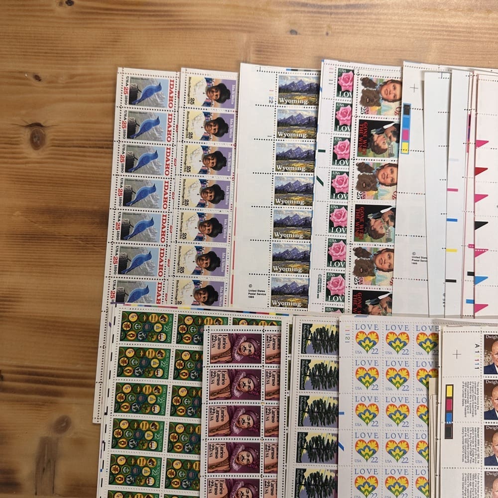 Stamp value denominations are all below the current First-Class rate, and may be self-adhesive or moisture activated, unless otherwise noted in the product title or description below.