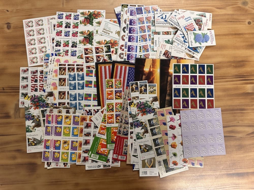 Lot of low-denomination postage stamps with values under the current First-Class rate.