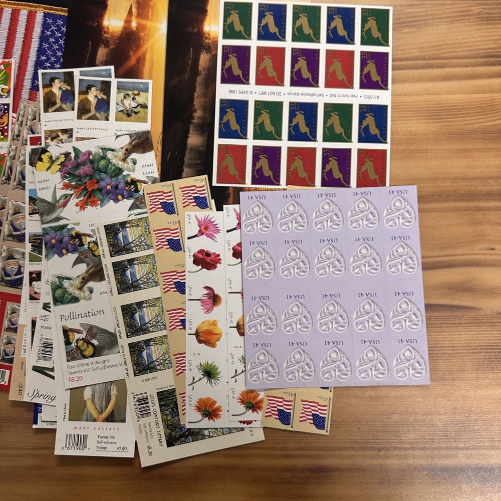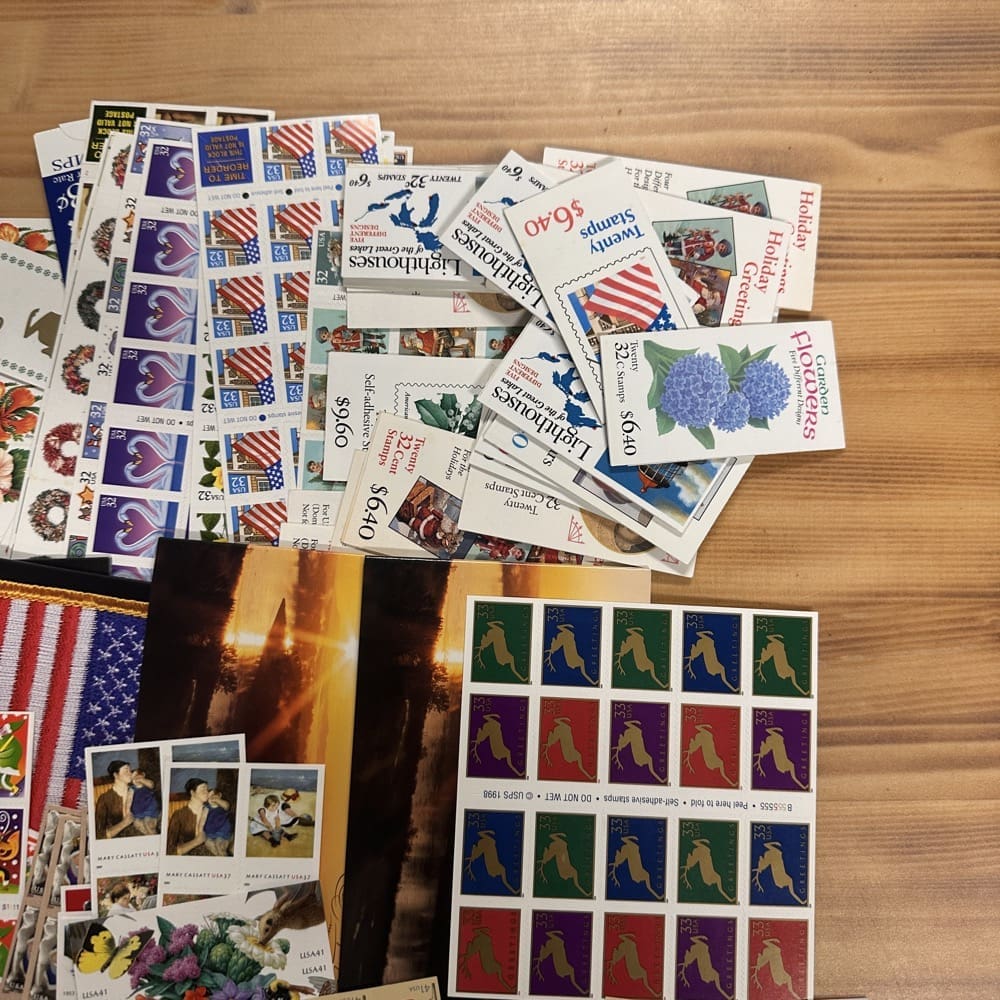 Stamp value denominations are all below the current First-Class rate, and may be self-adhesive or moisture activated, unless otherwise noted in the product title or description below.