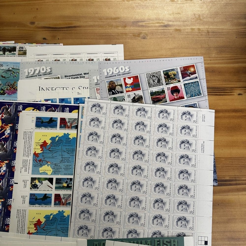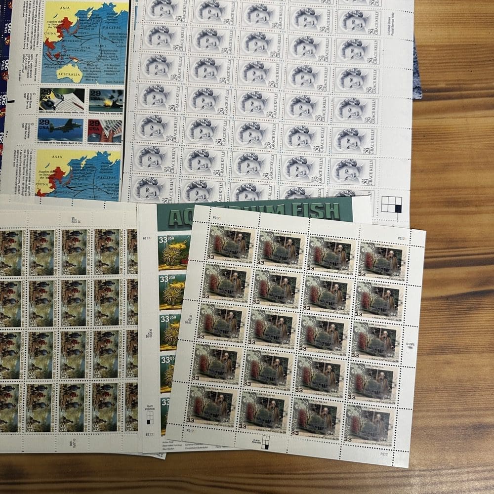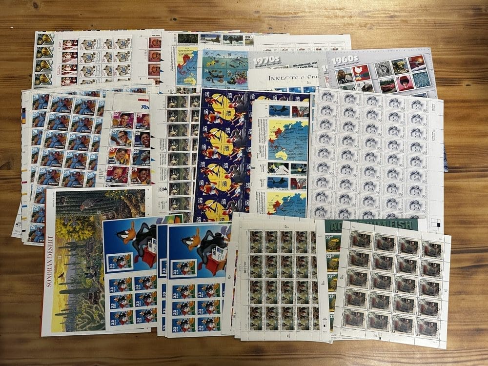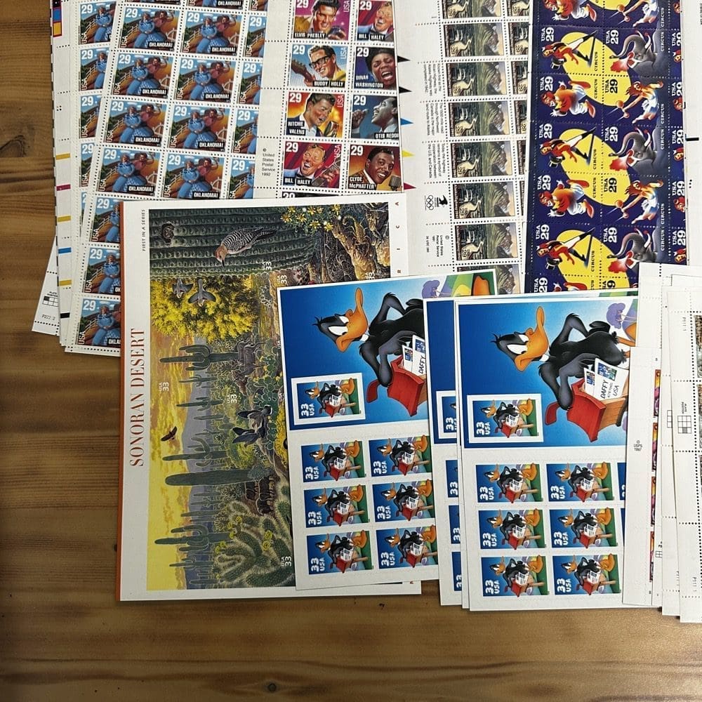Stamp value denominations are all below the current First-Class rate, and may be self-adhesive or moisture activated, unless otherwise noted in the product title or description below.