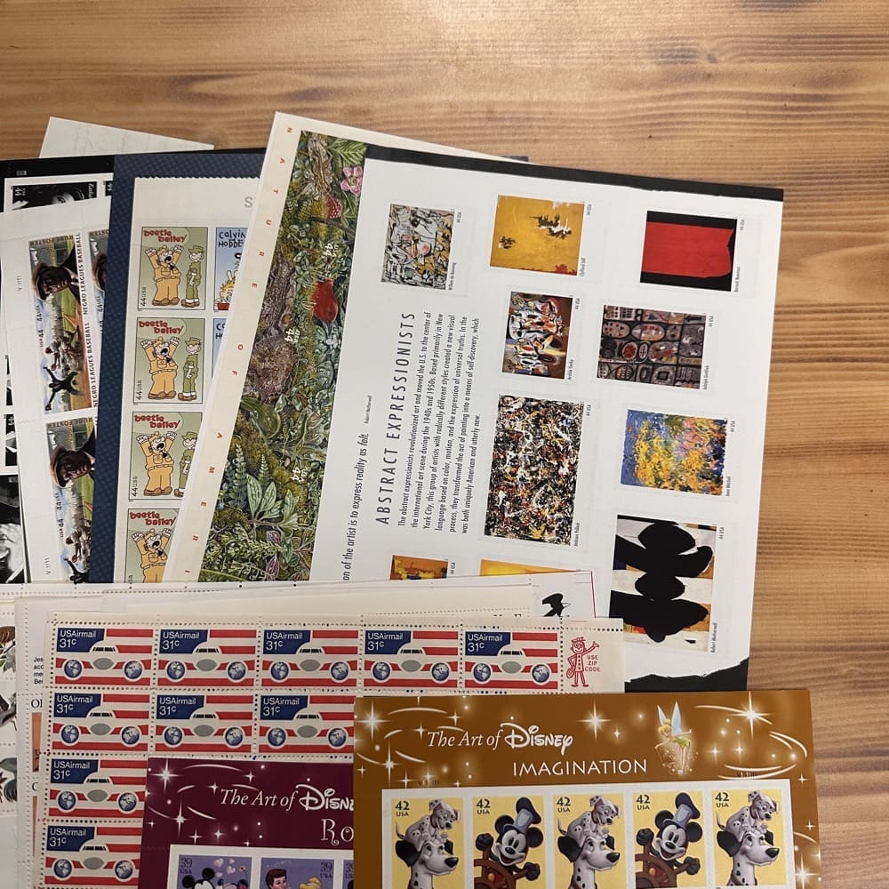 Stamp value denominations are all below the current First-Class rate, and may be self-adhesive or moisture activated, unless otherwise noted in the product title or description below.