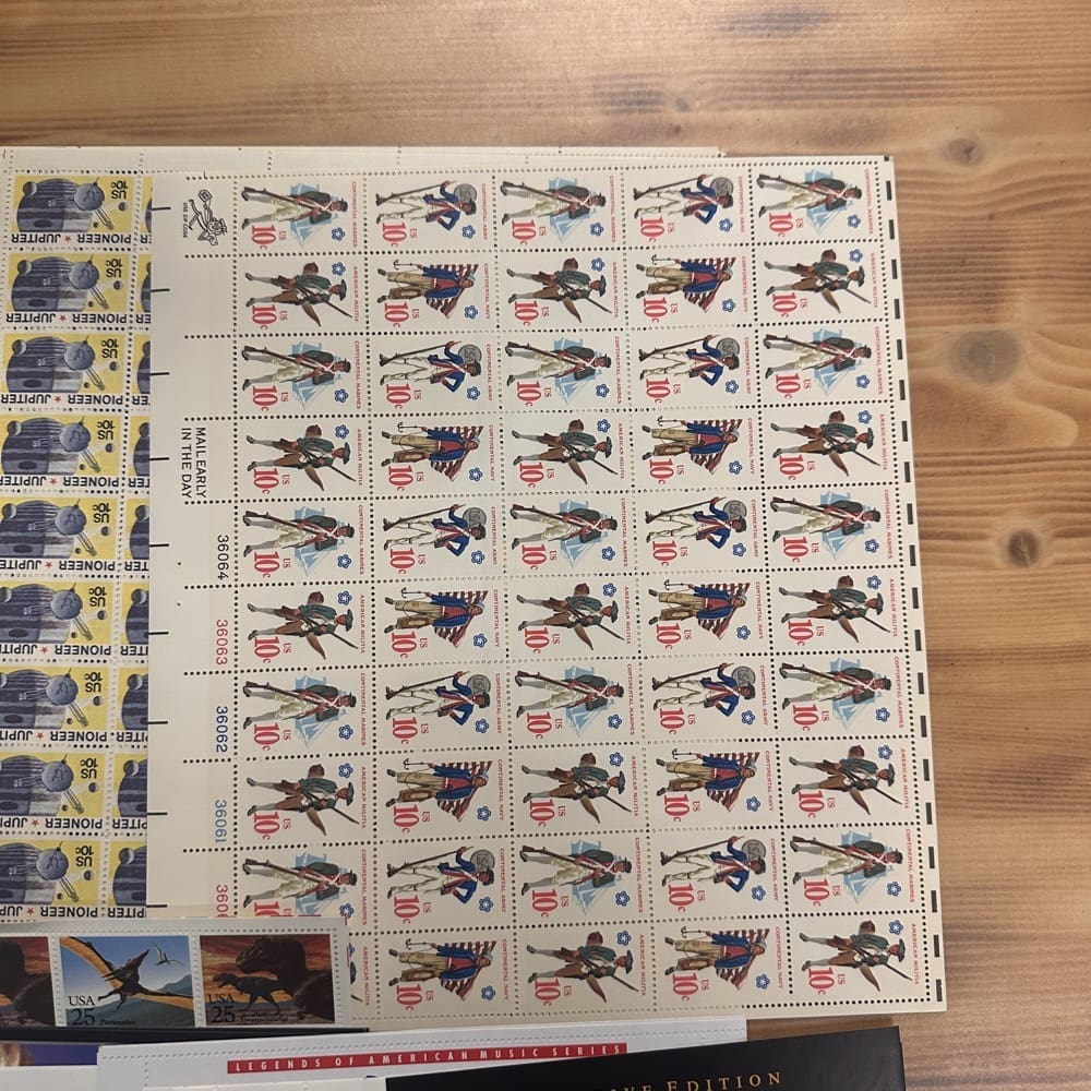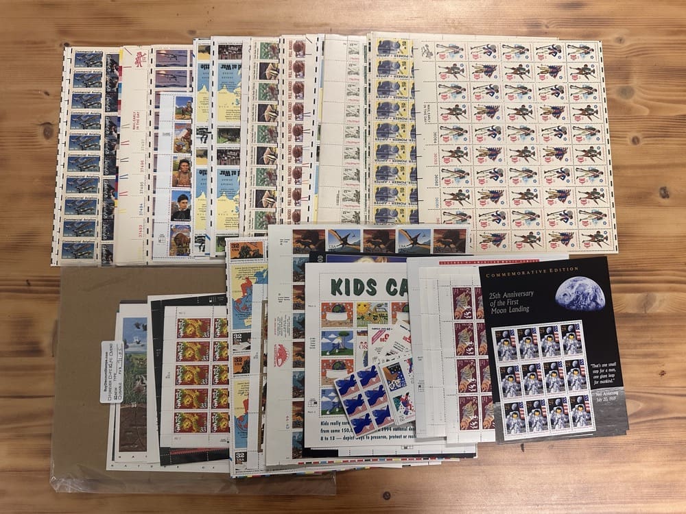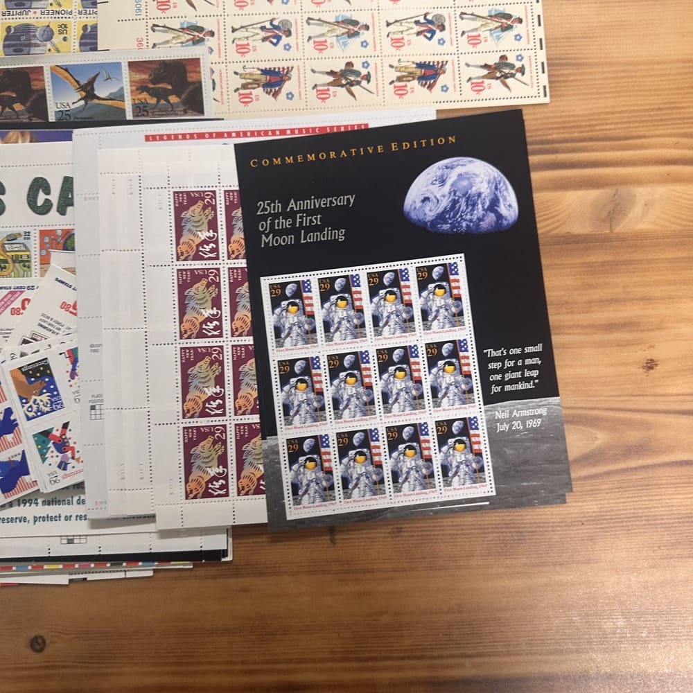 Stamp value denominations are all below the current First-Class rate, and may be self-adhesive or moisture activated, unless otherwise noted in the product title or description below.