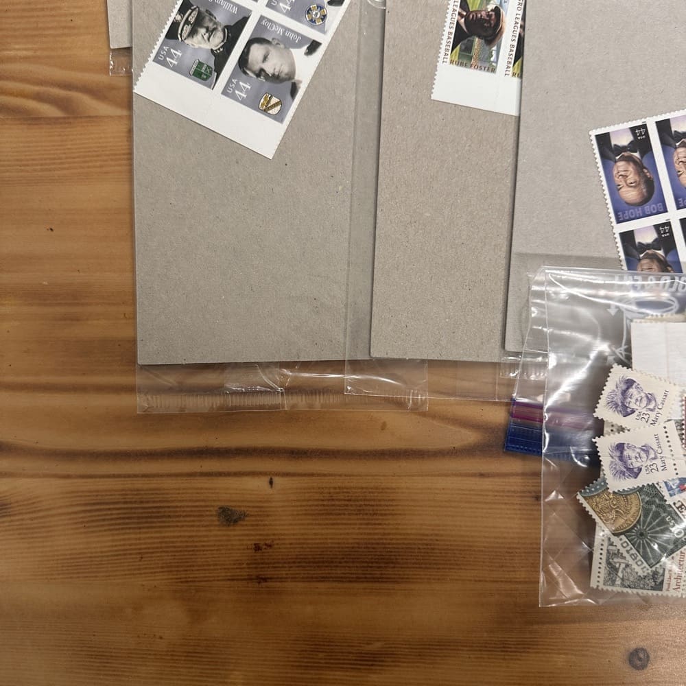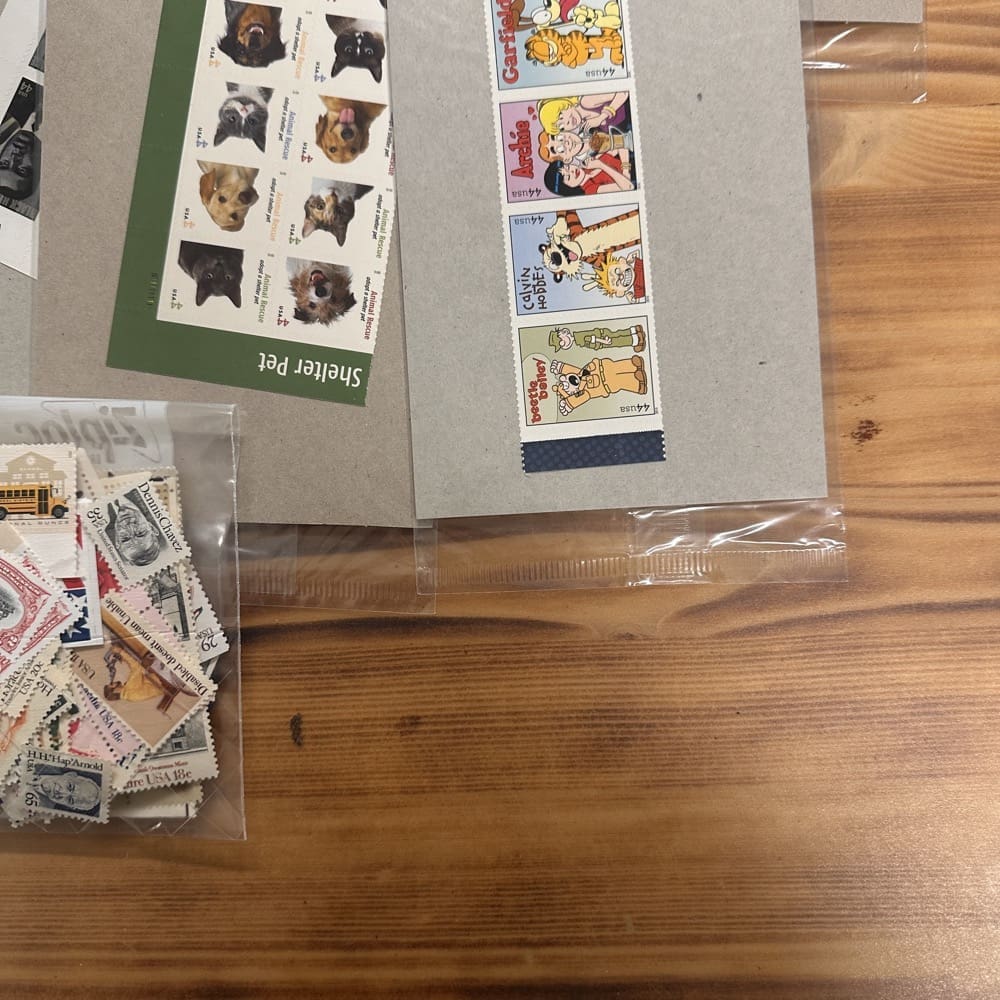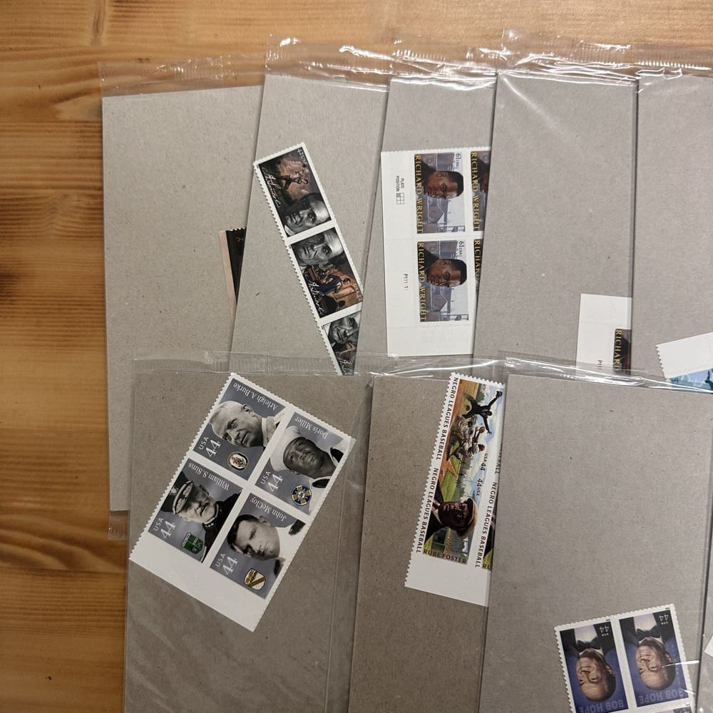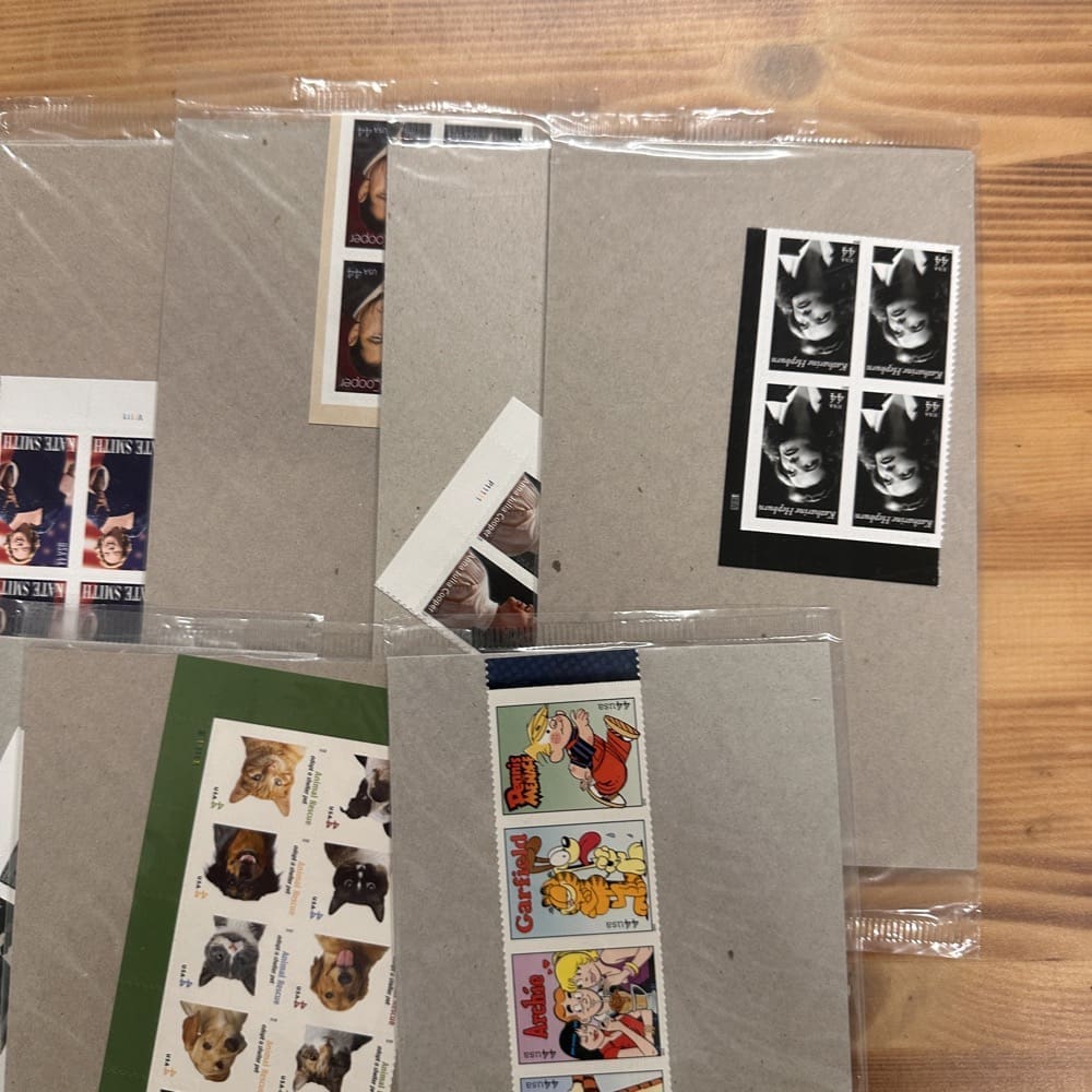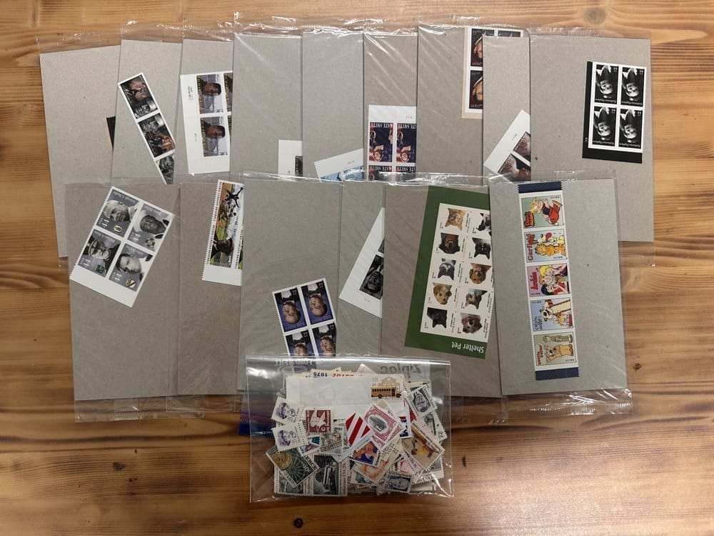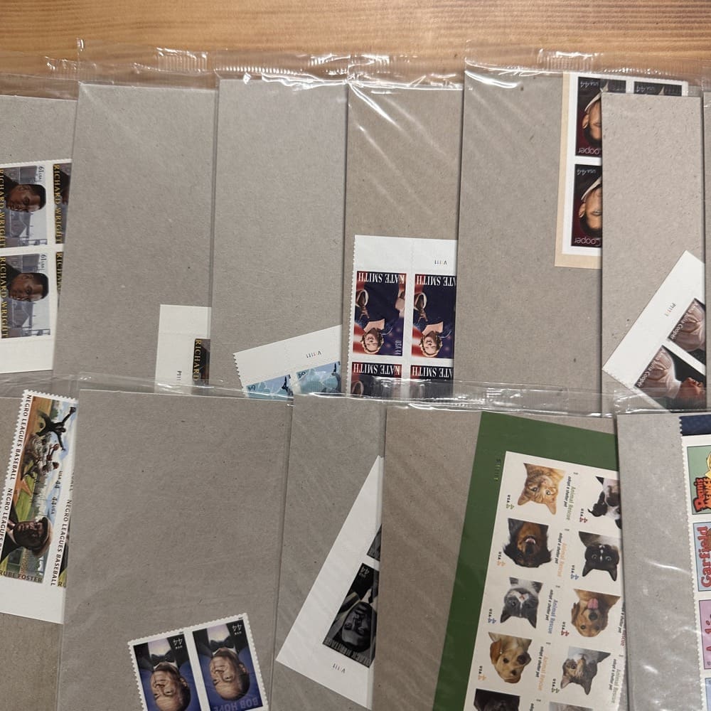 Stamp value denominations are all below the current First-Class rate, and may be self-adhesive or moisture activated, unless otherwise noted in the product title or description below.