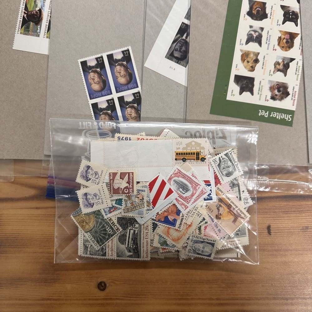 Lot of low-denomination postage stamps with values under the current First-Class rate.