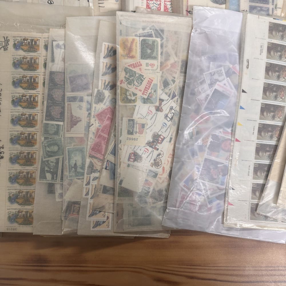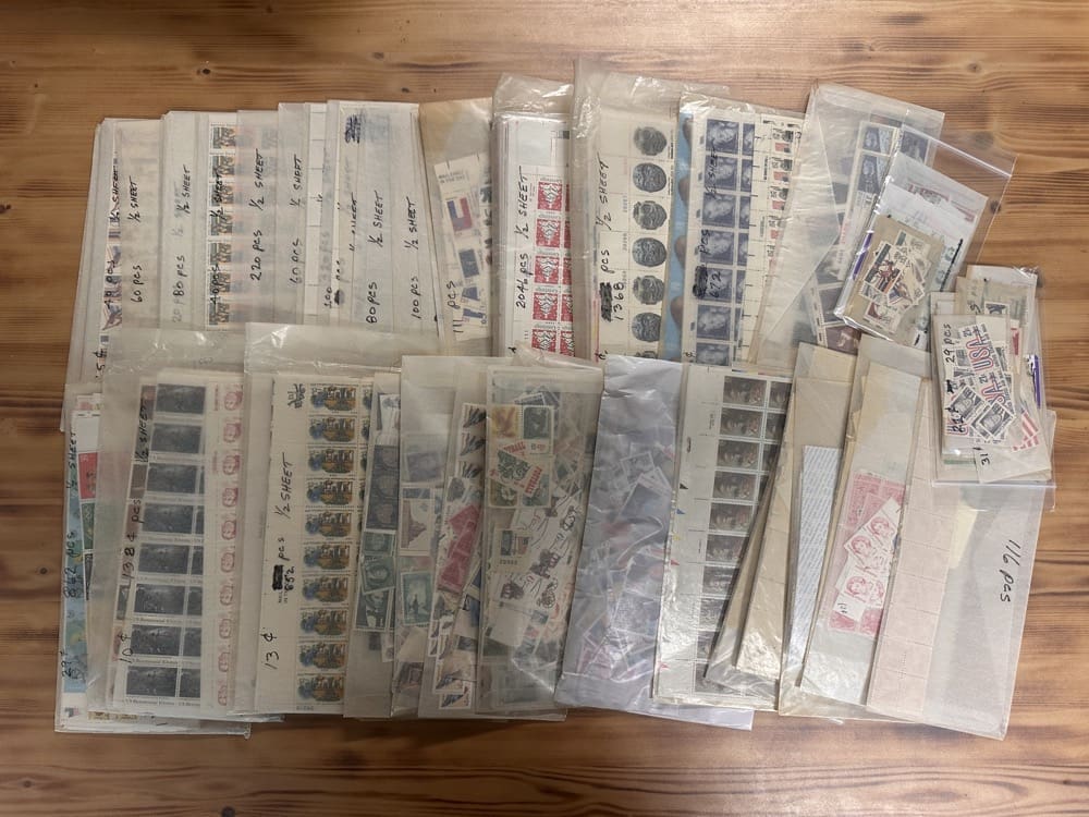 Lot of low-denomination postage stamps with values under the current First-Class rate.