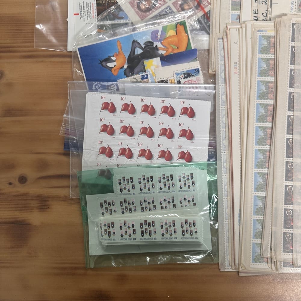 Lot of low-denomination postage stamps with values under the current First-Class rate.