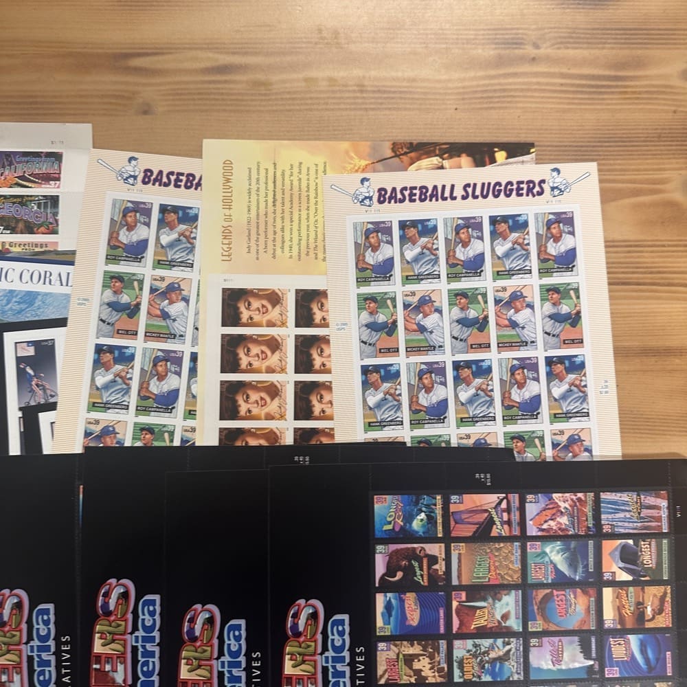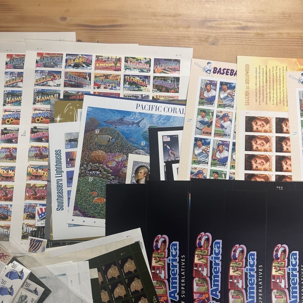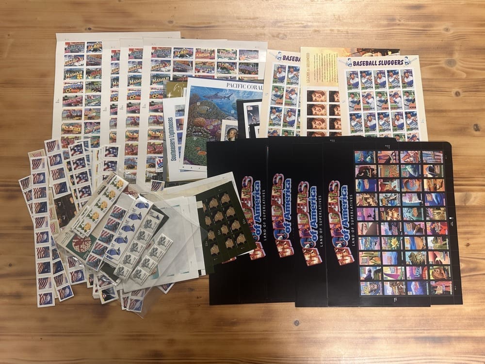 Stamp value denominations are all below the current First-Class rate, and may be self-adhesive or moisture activated, unless otherwise noted in the product title or description below.