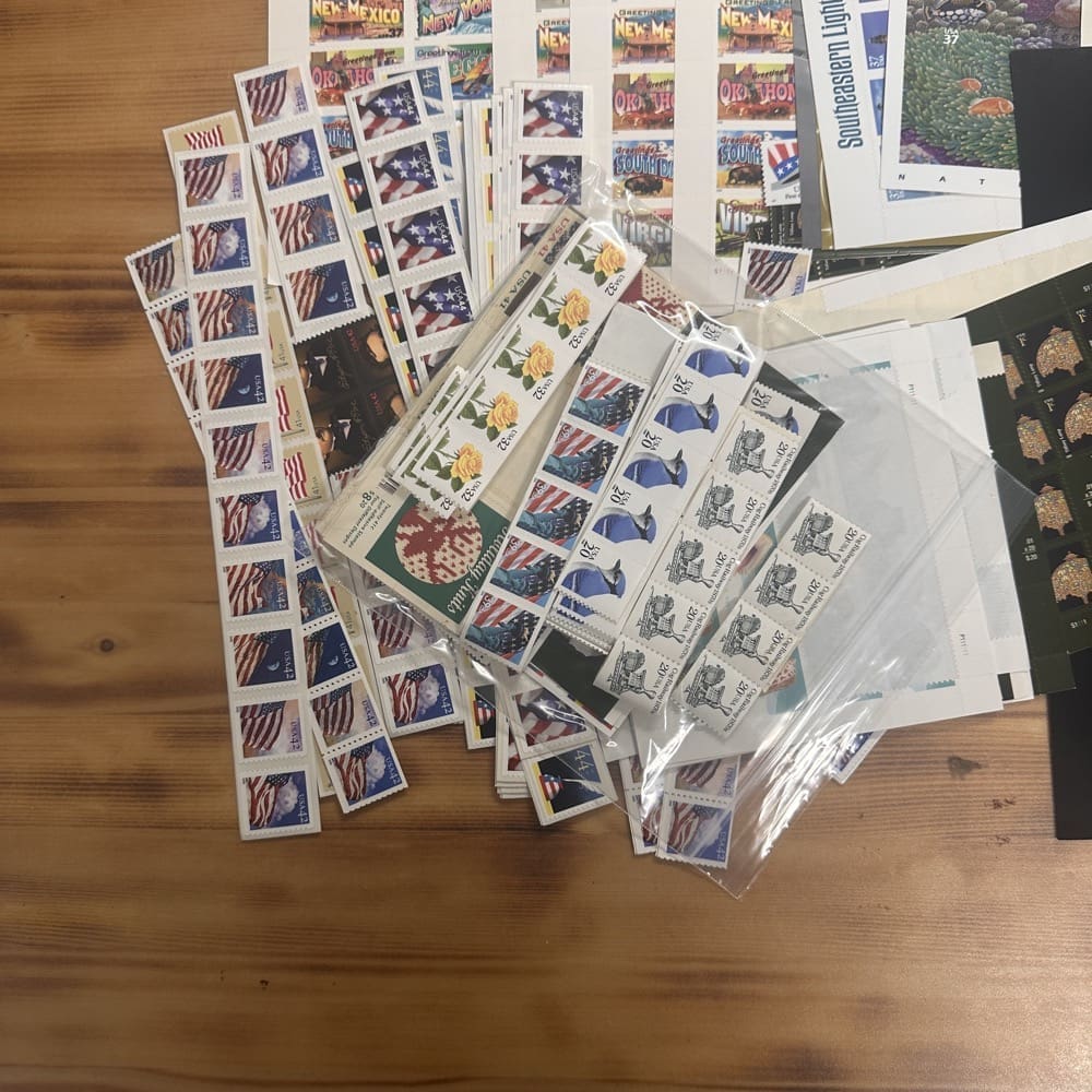 Lot of low-denomination postage stamps with values under the current First-Class rate.