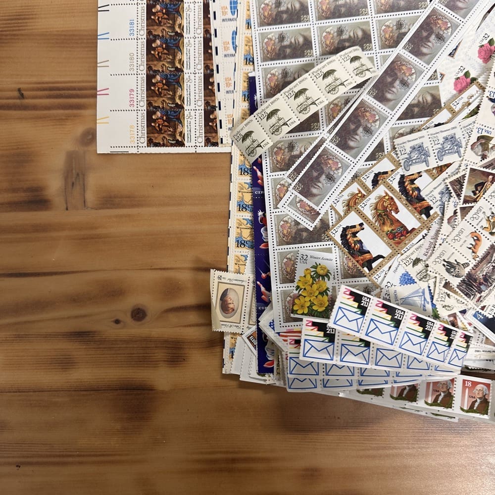 Lot of low-denomination postage stamps with values under the current First-Class rate.