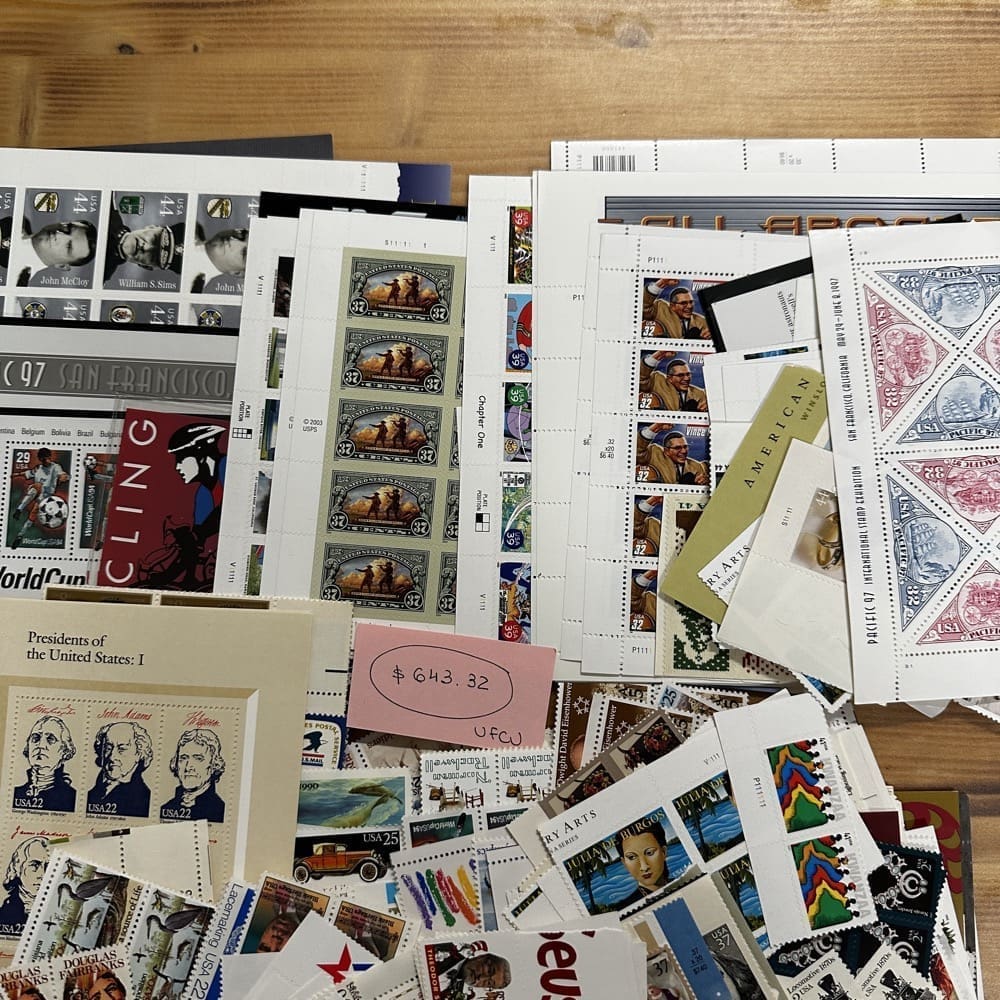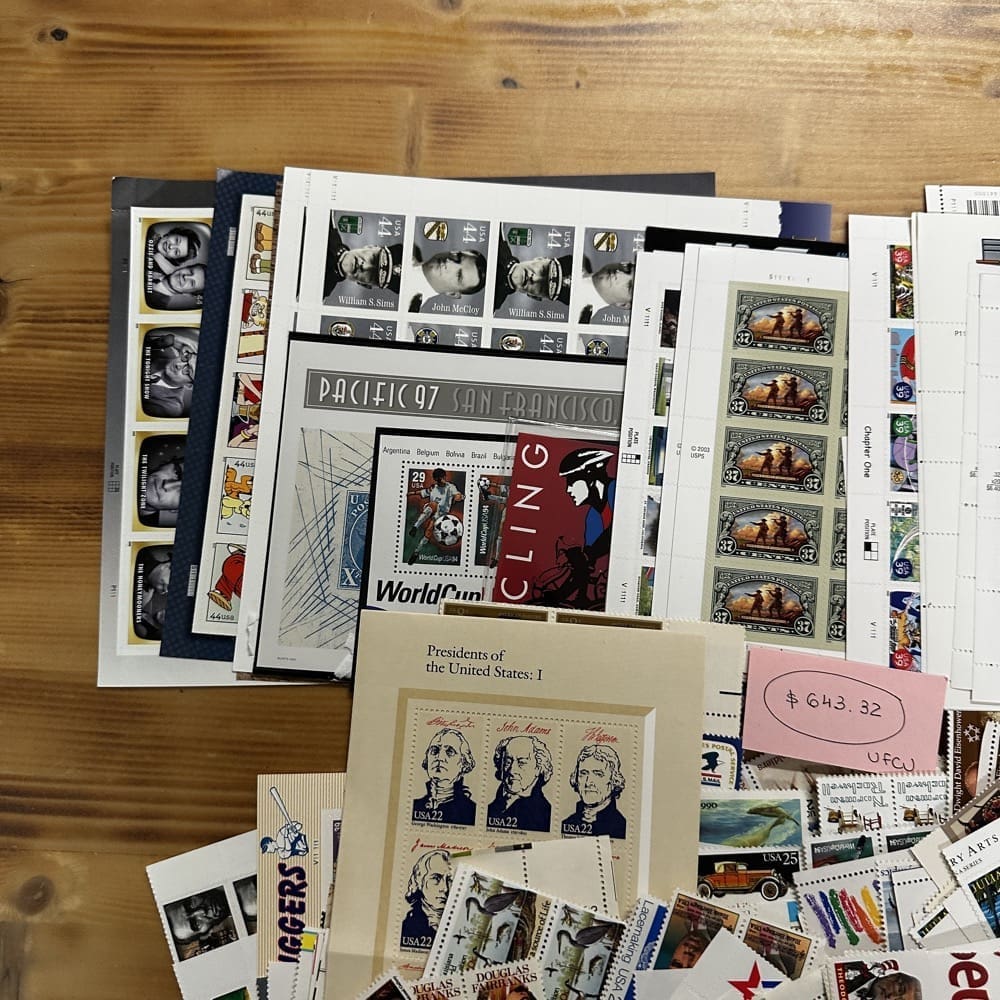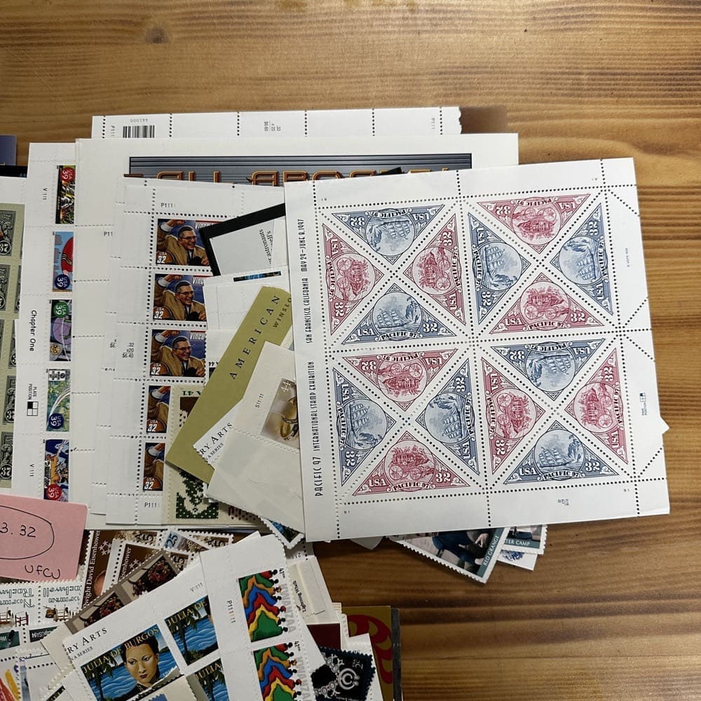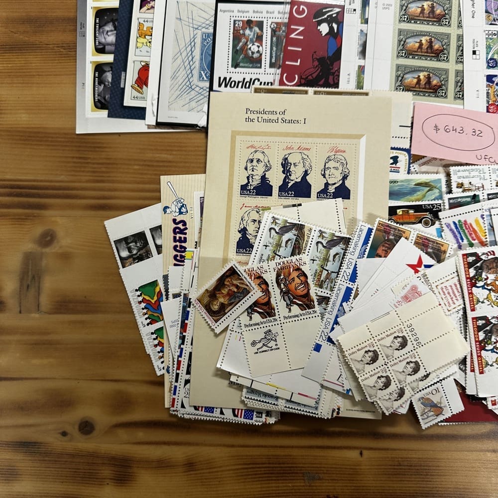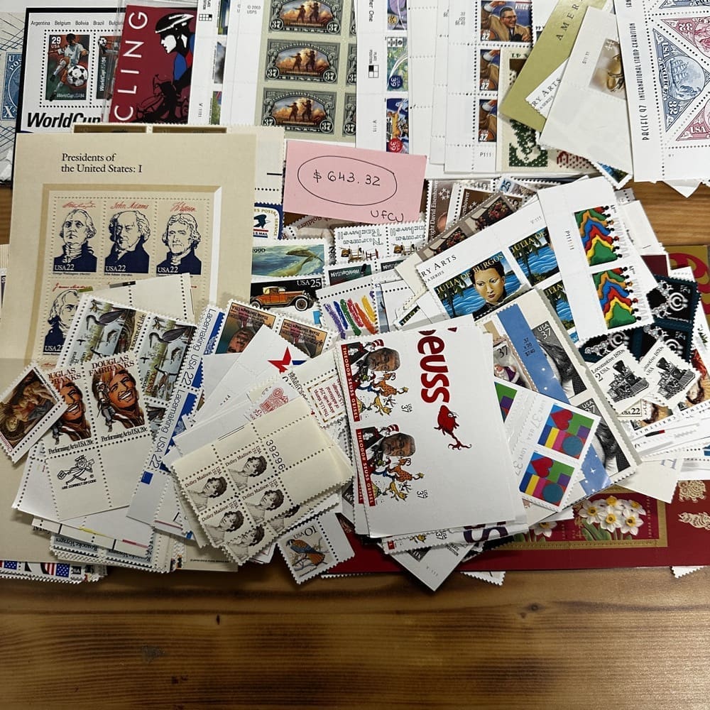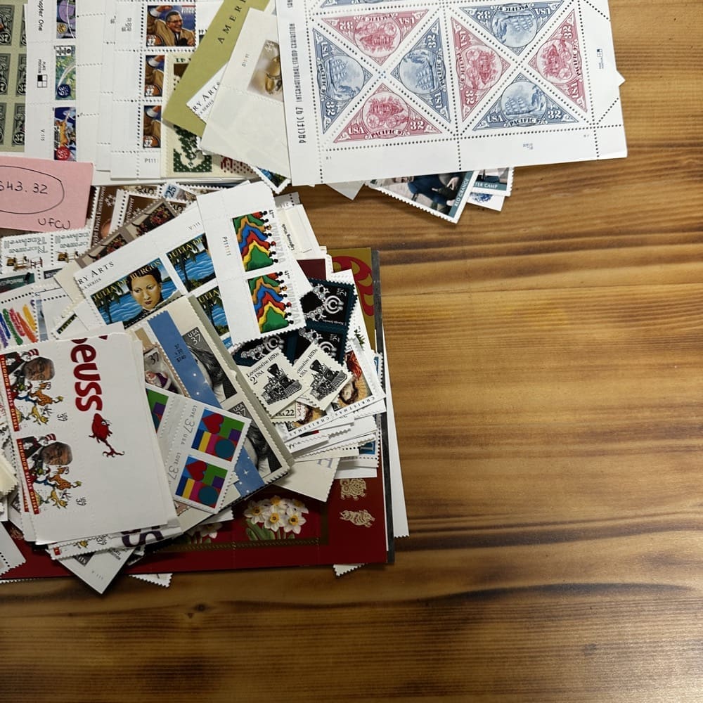 Lot of low-denomination postage stamps with values under the current First-Class rate.
