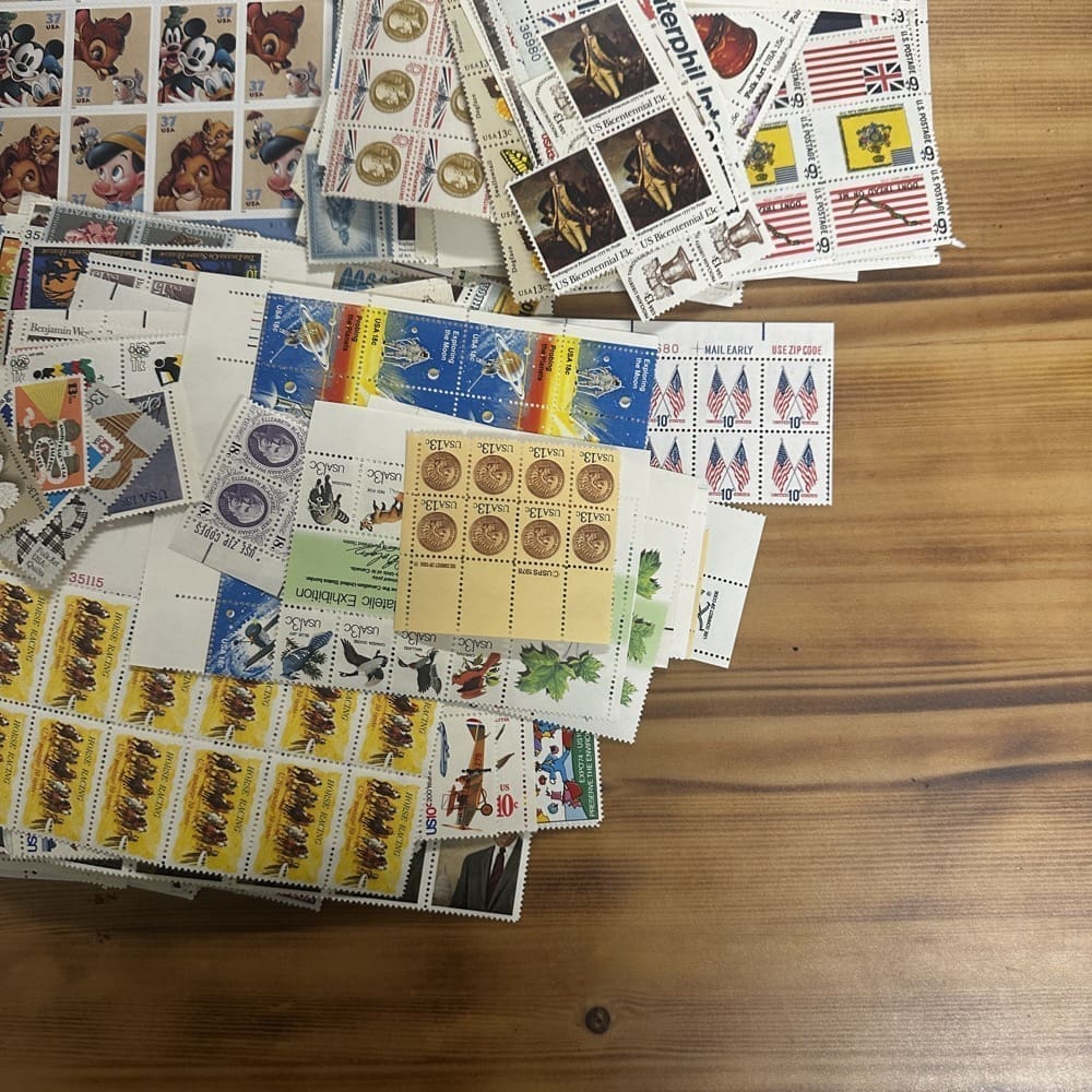 Lot of low-denomination postage stamps with values under the current First-Class rate.