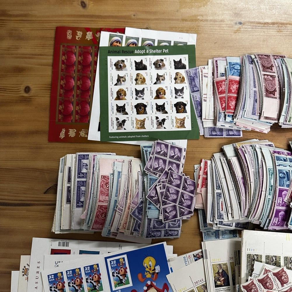 Lot of low-denomination postage stamps with values under the current First-Class rate.