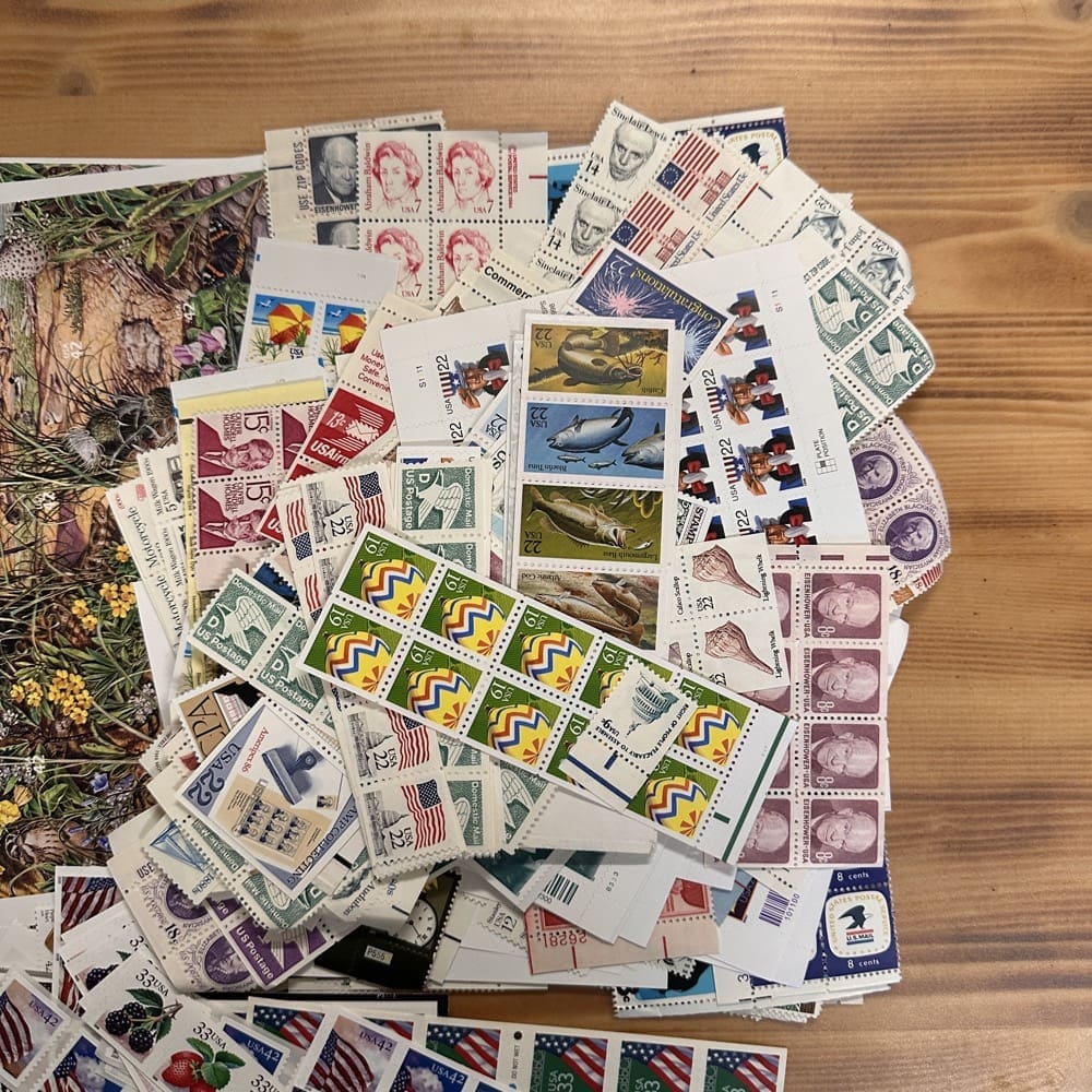Lot of low-denomination postage stamps with values under the current First-Class rate.