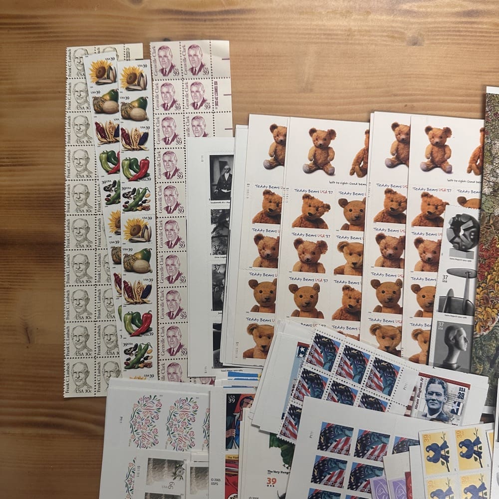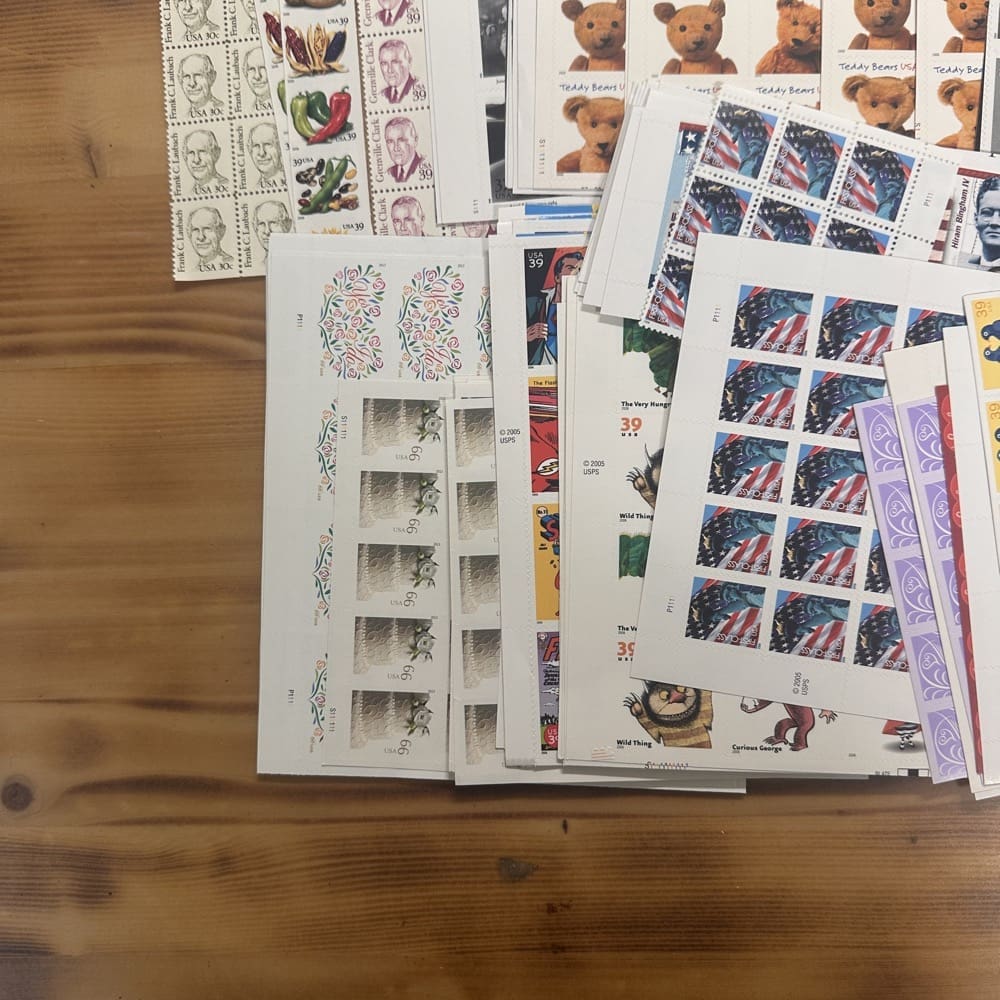 Stamp value denominations are all below the current First-Class rate, and may be self-adhesive or moisture activated, unless otherwise noted in the product title or description below.