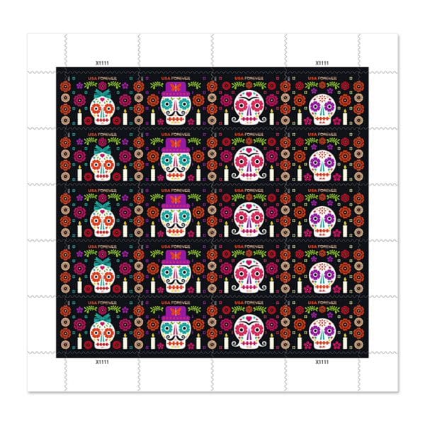 This pane of 20 Forever stamps contains five identical rows of four colorful stamps featuring several iconic elements of a traditional Day of the Dead offering.