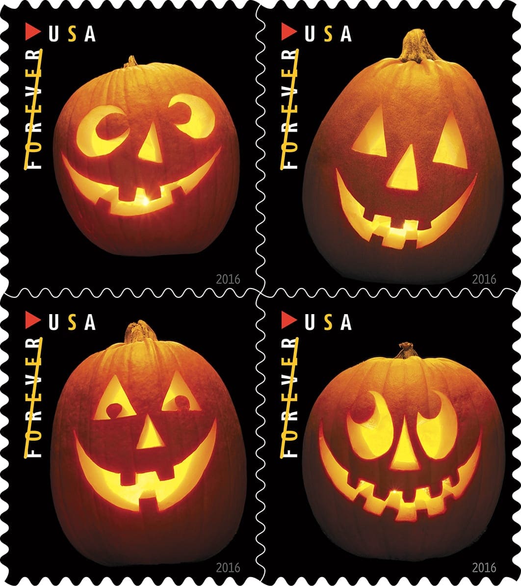 4 happy Halloween Jack-O’-Lantern pumpkin faces.