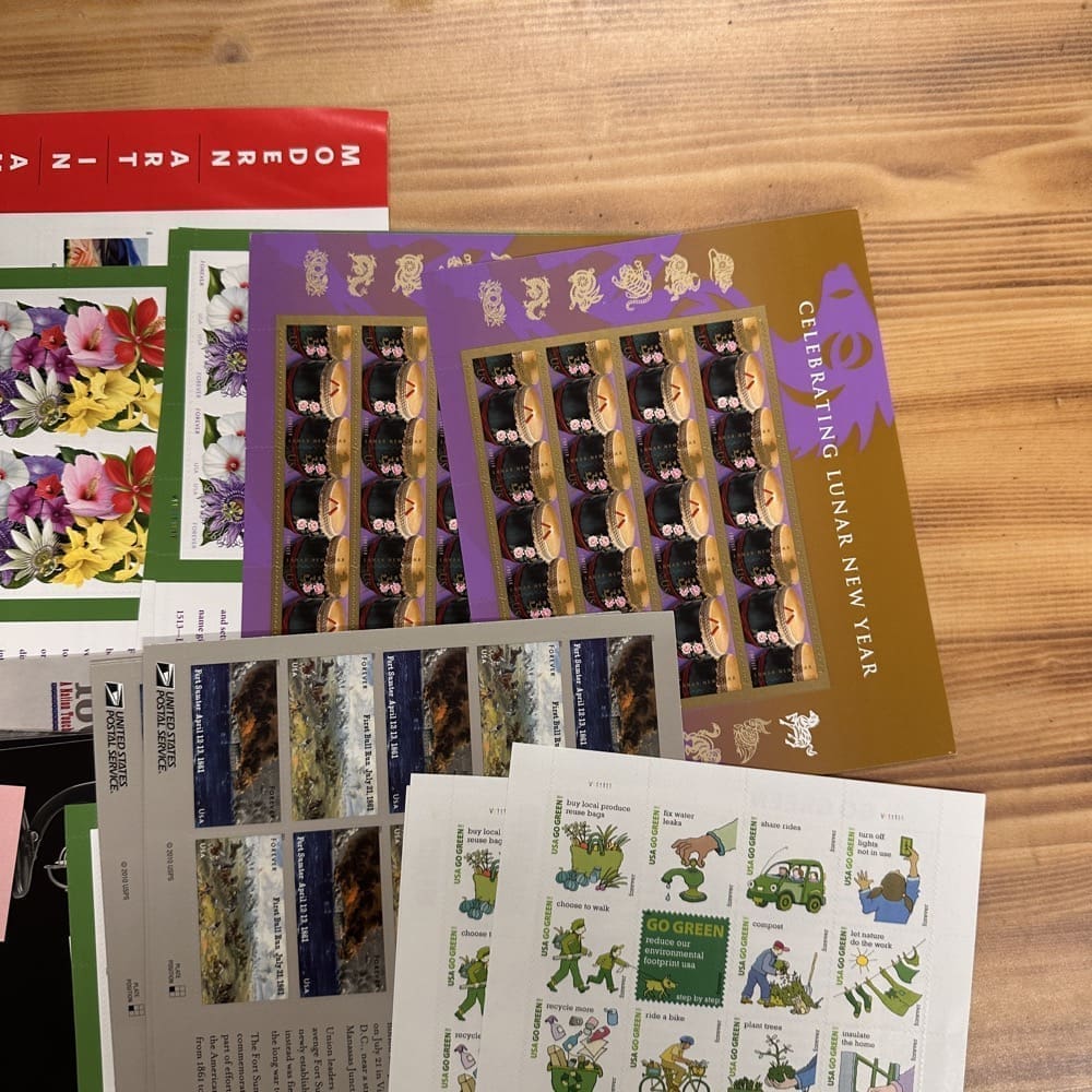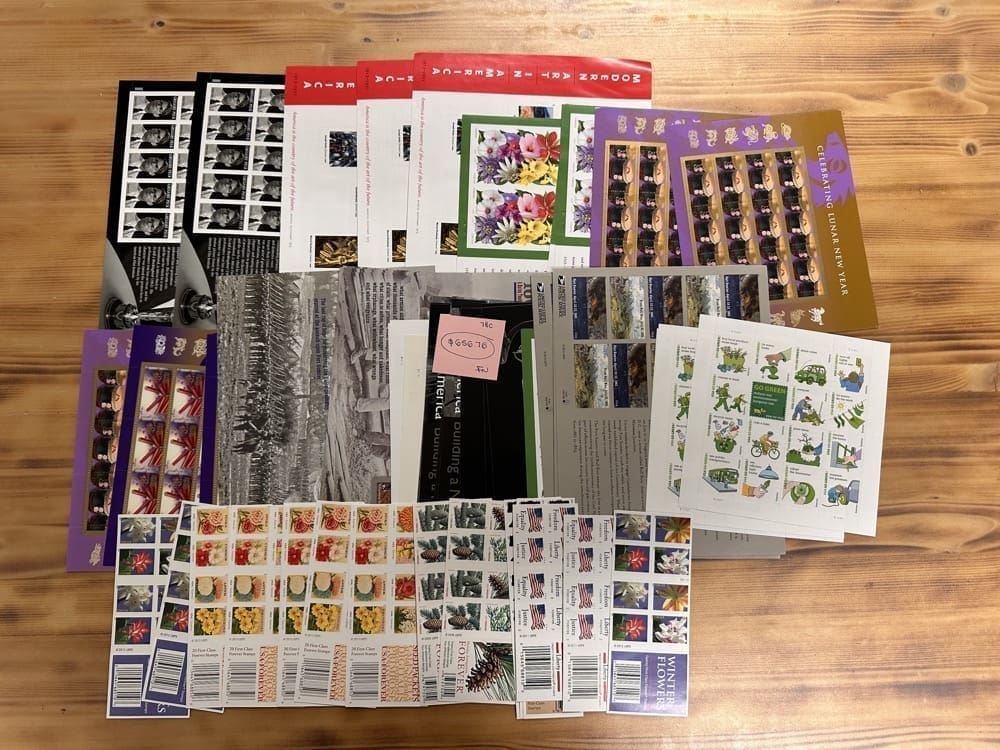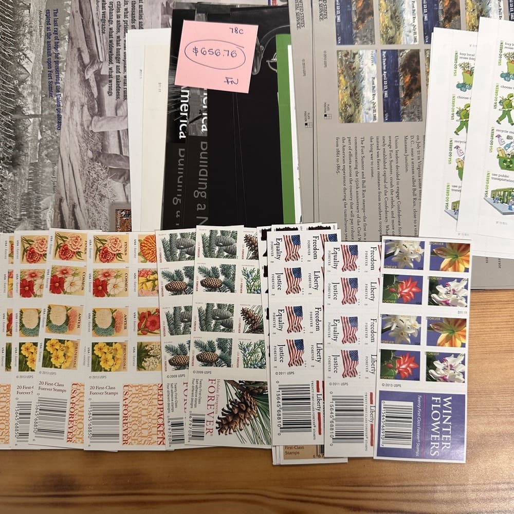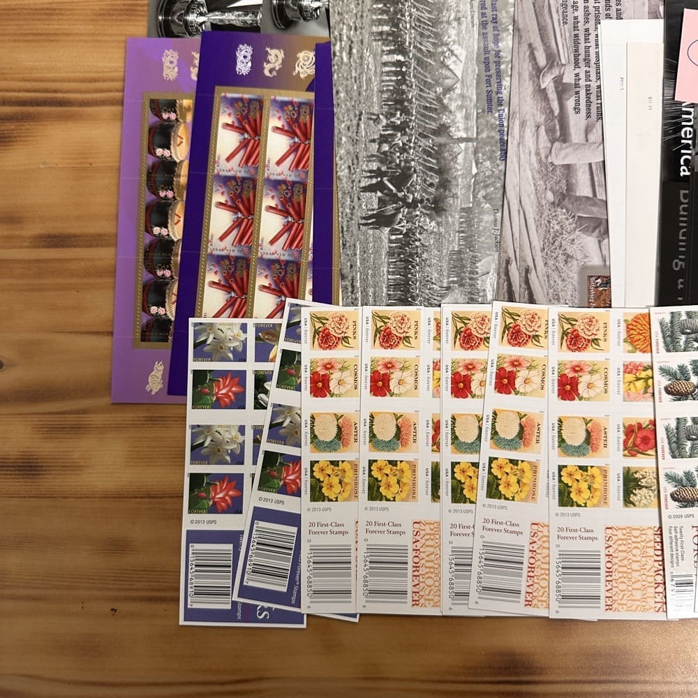 Lot of First-Class Forever® stamps in various designs.