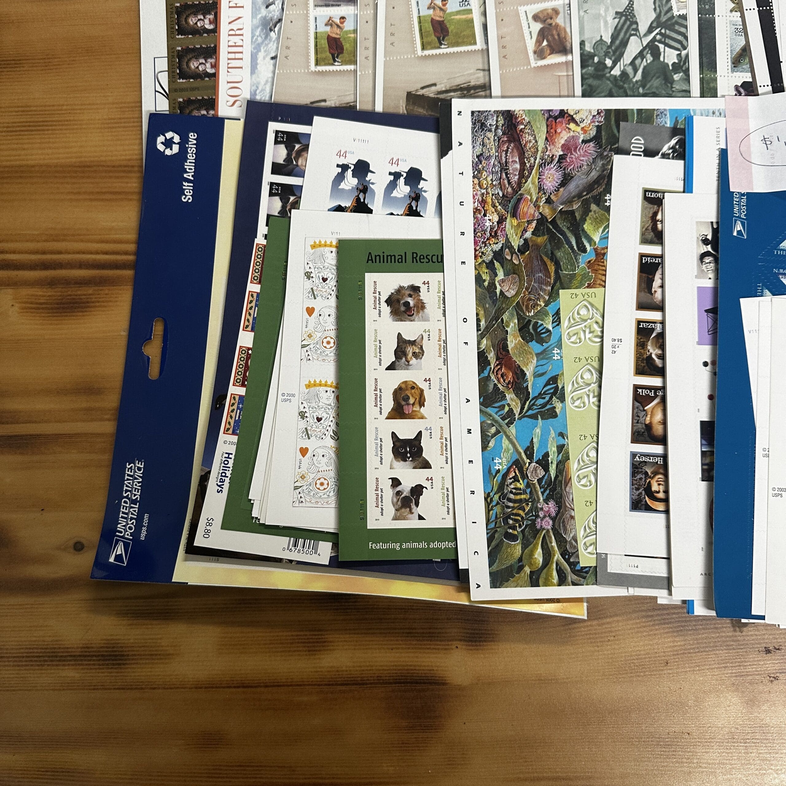 Lot of low-denomination postage stamps with values under the current First-Class rate.