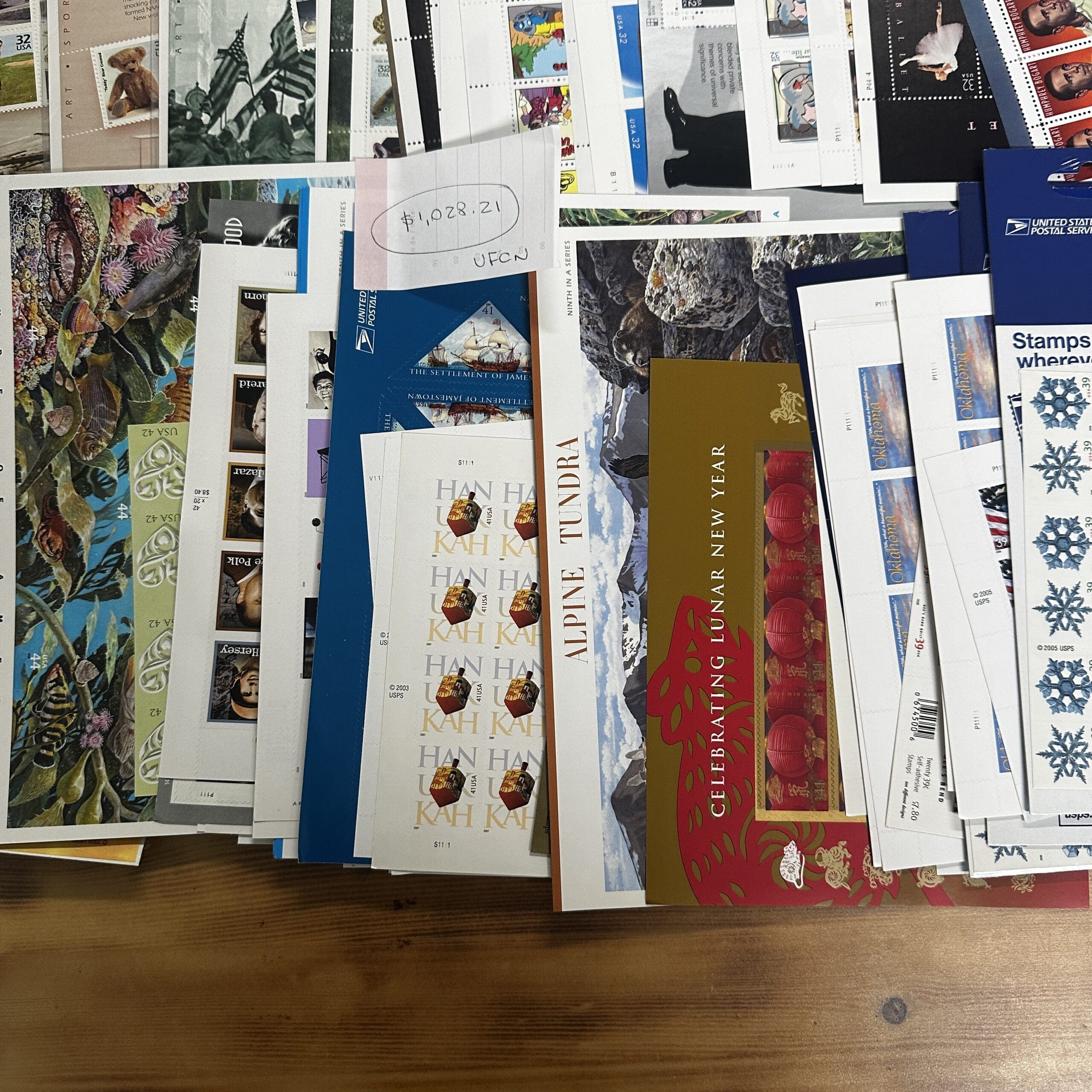 Stamp value denominations are all below the current First-Class rate, and may be self-adhesive or moisture activated, unless otherwise noted in the product title or description below.