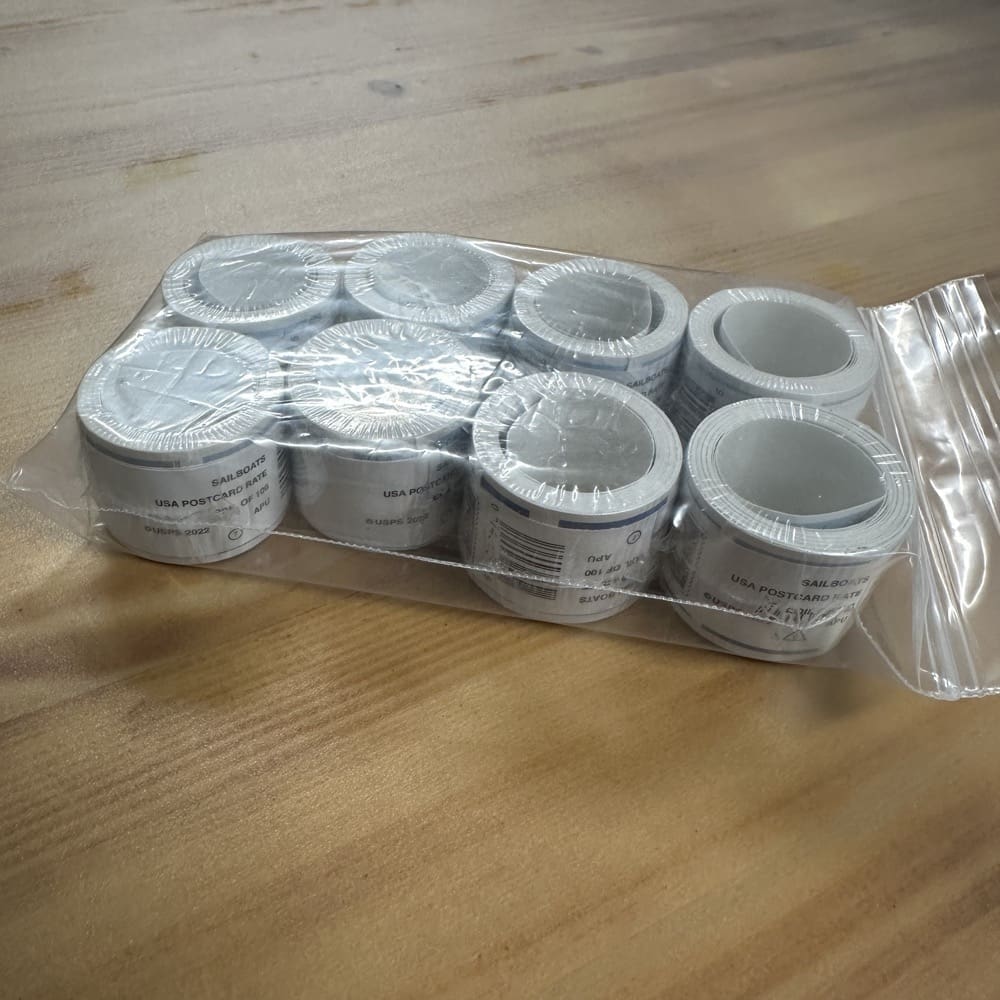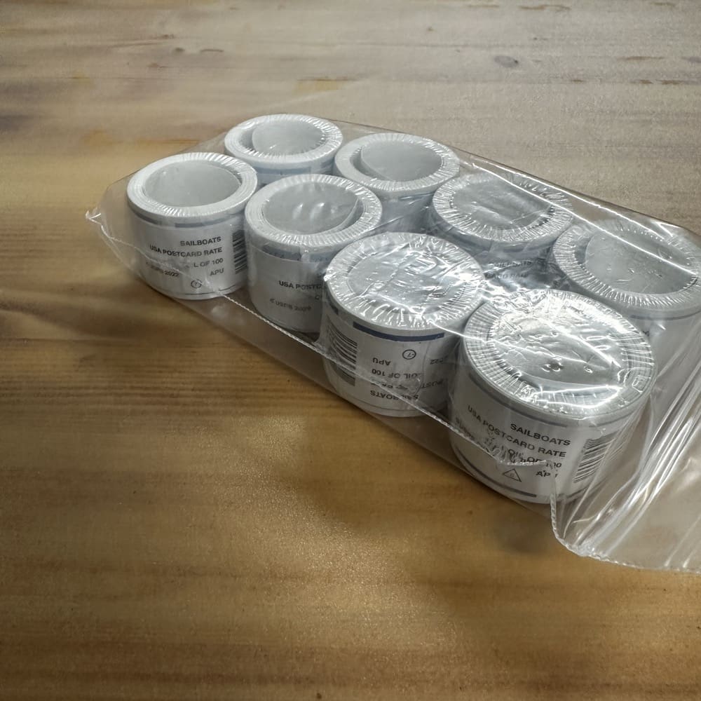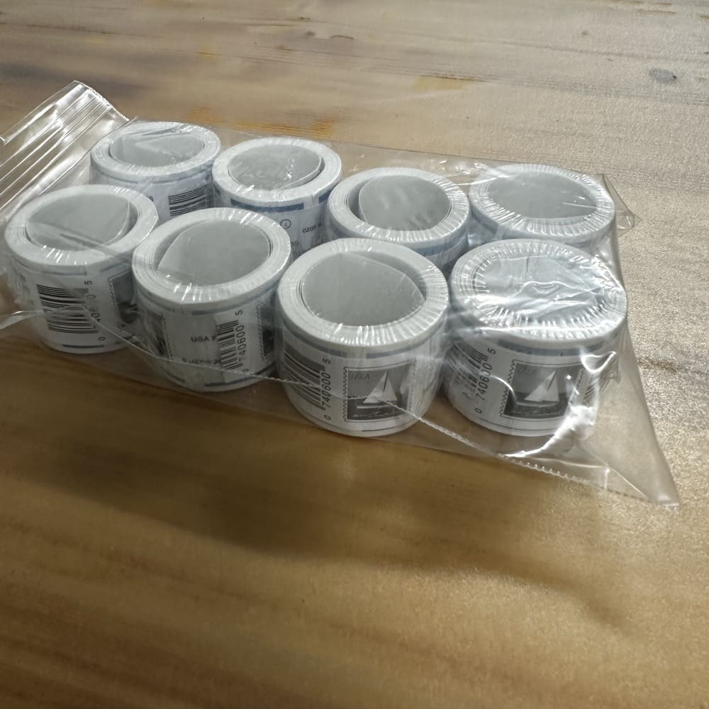 Stamp value denominations are all below the current First-Class rate, and may be self-adhesive or moisture activated, unless otherwise noted in the product title or description below.