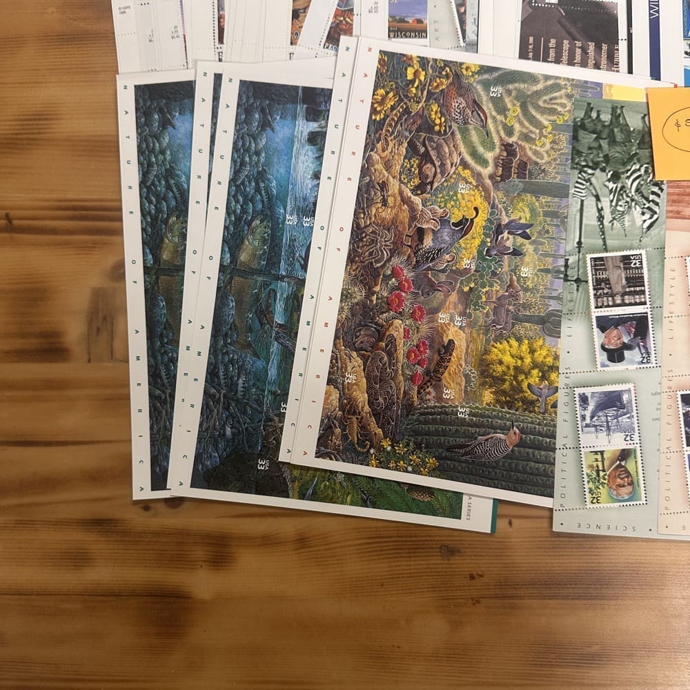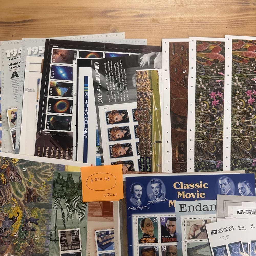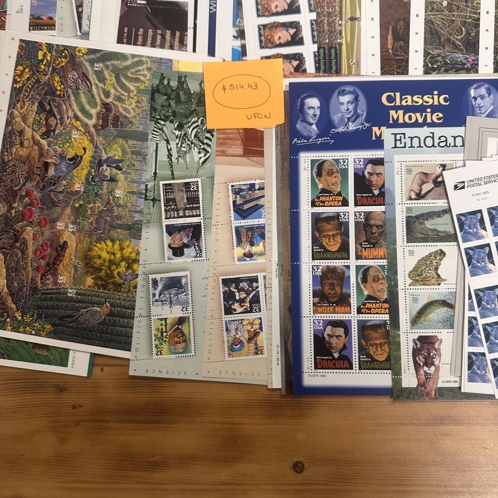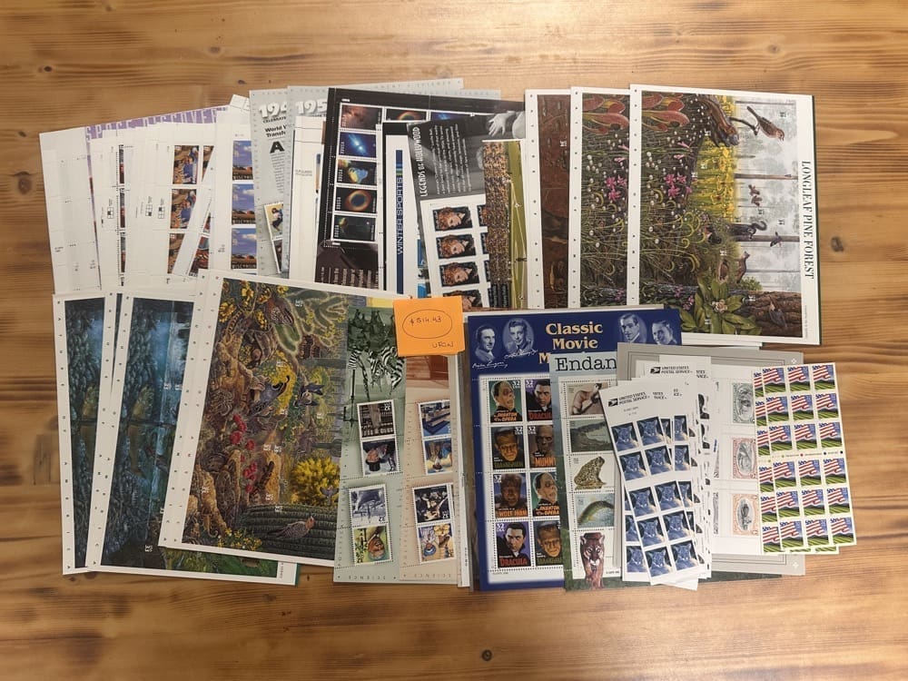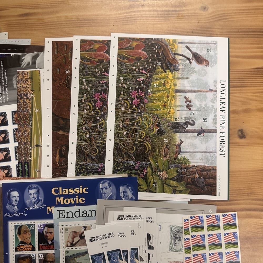 Stamp value denominations are all below the current First-Class rate, and may be self-adhesive or moisture activated, unless otherwise noted in the product title or description below.
