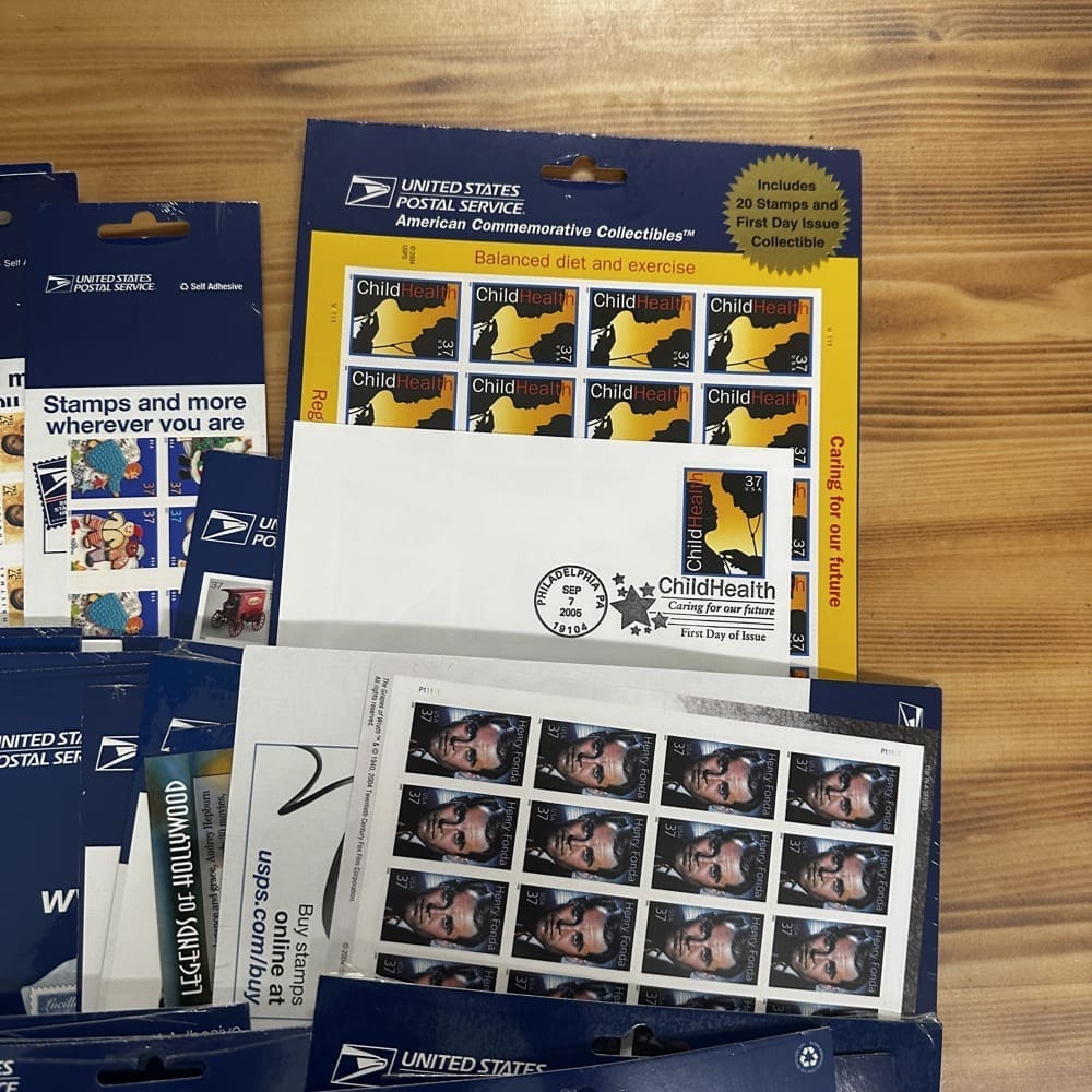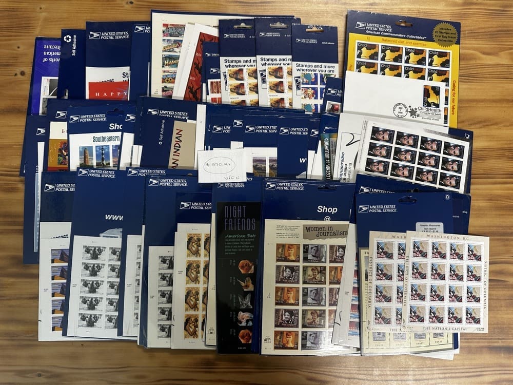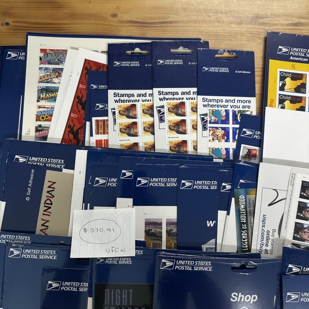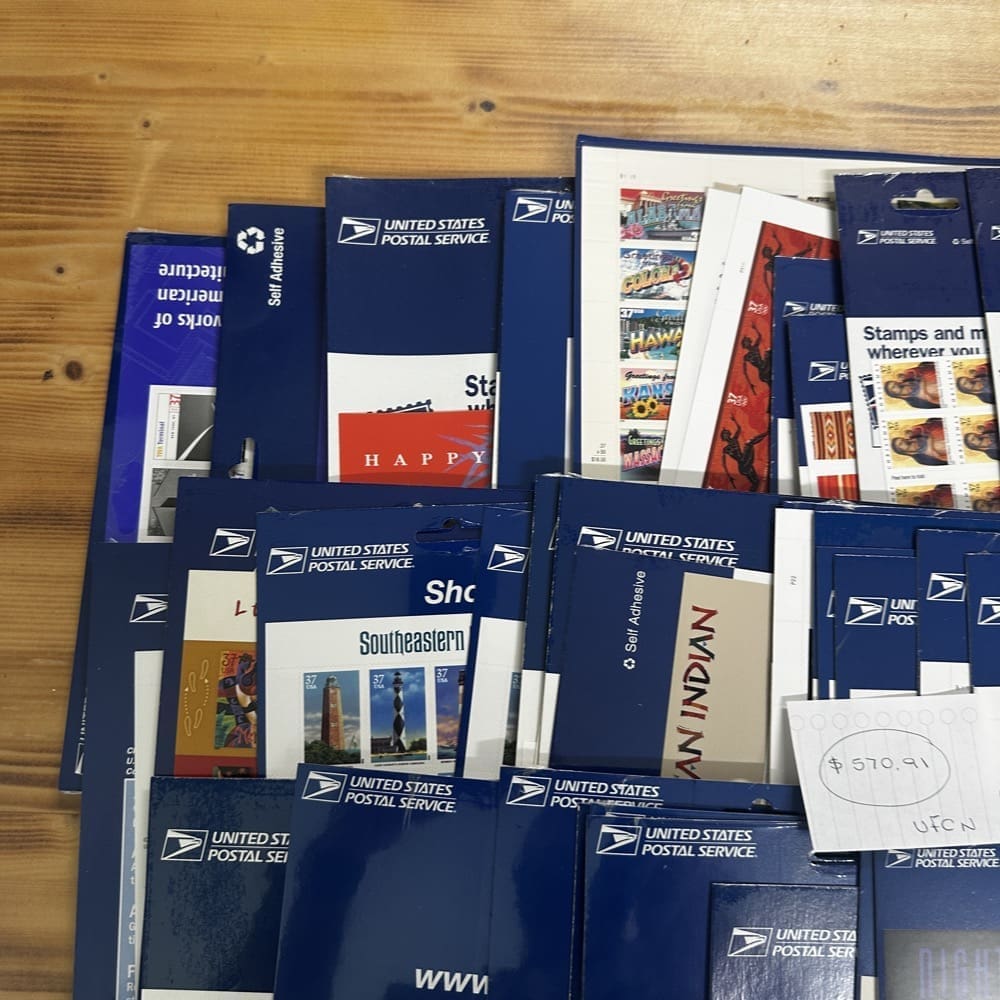 Stamp value denominations are all below the current First-Class rate, and may be self-adhesive or moisture activated, unless otherwise noted in the product title or description below.