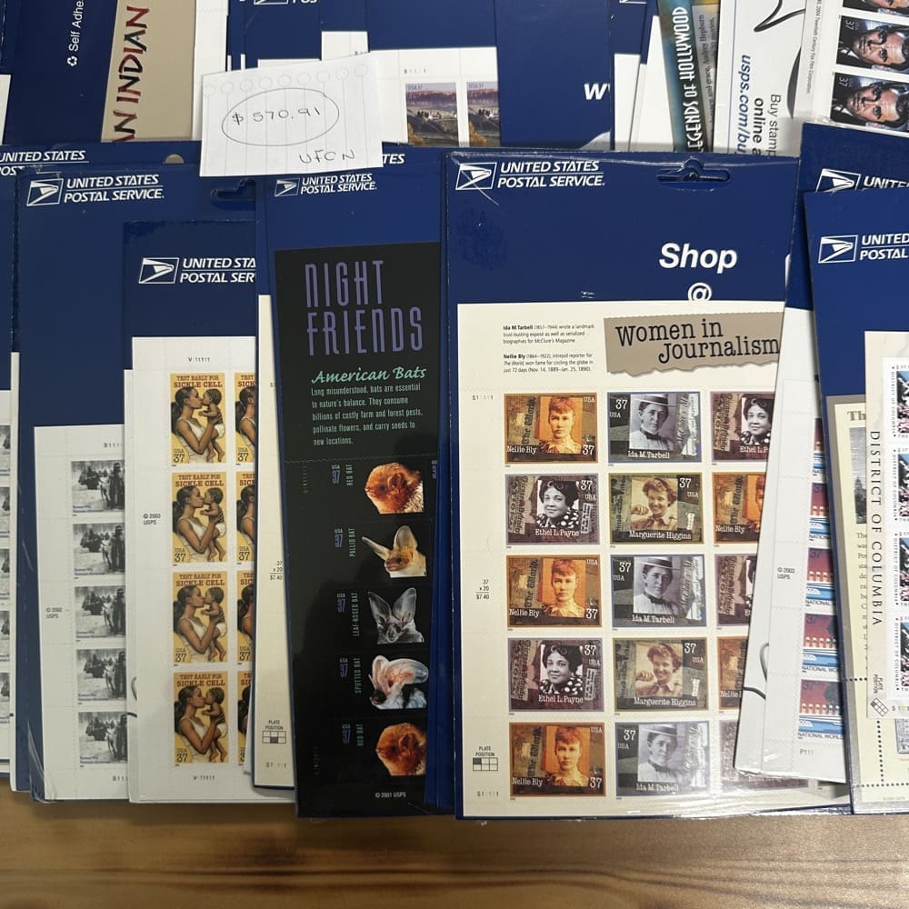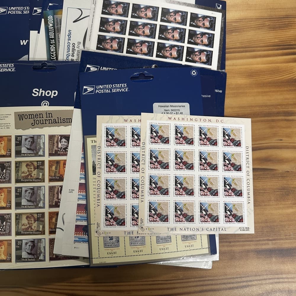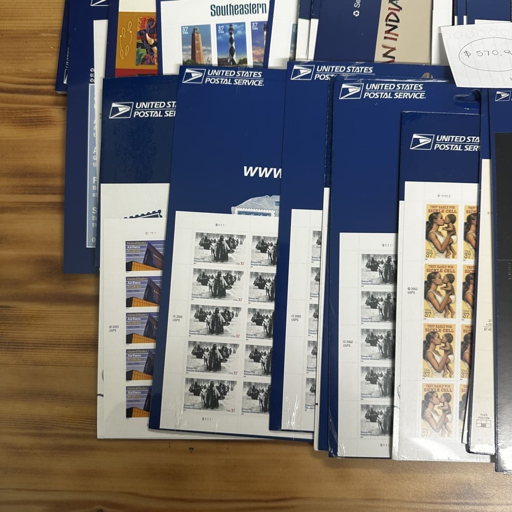 Stamp value denominations are all below the current First-Class rate, and may be self-adhesive or moisture activated, unless otherwise noted in the product title or description below.