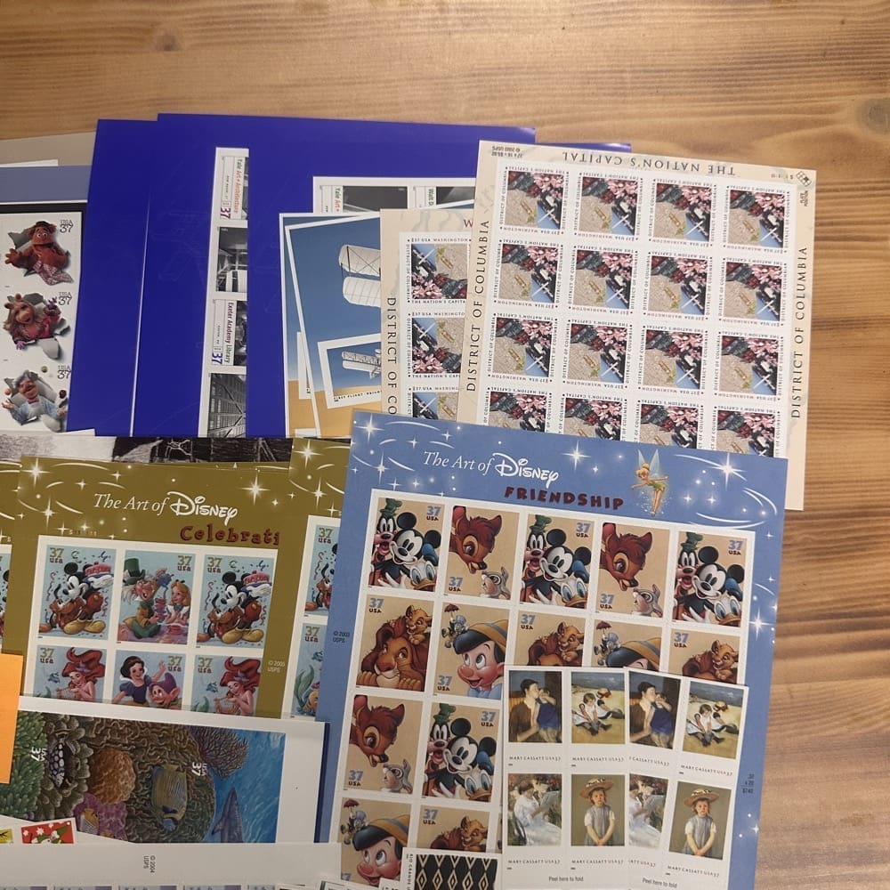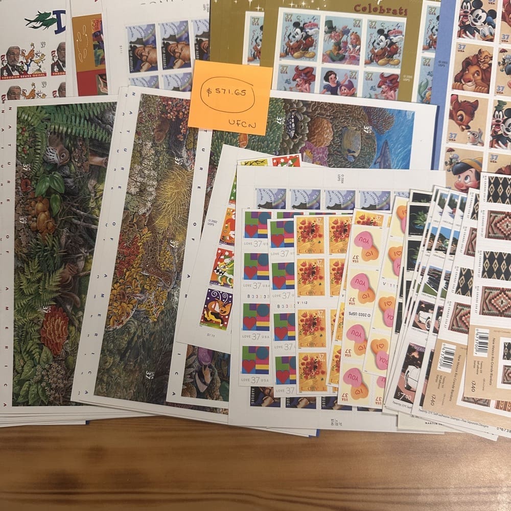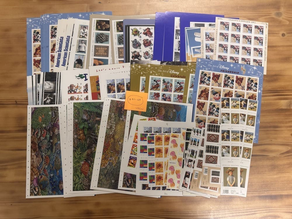 Stamp value denominations are all below the current First-Class rate, and may be self-adhesive or moisture activated, unless otherwise noted in the product title or description below.