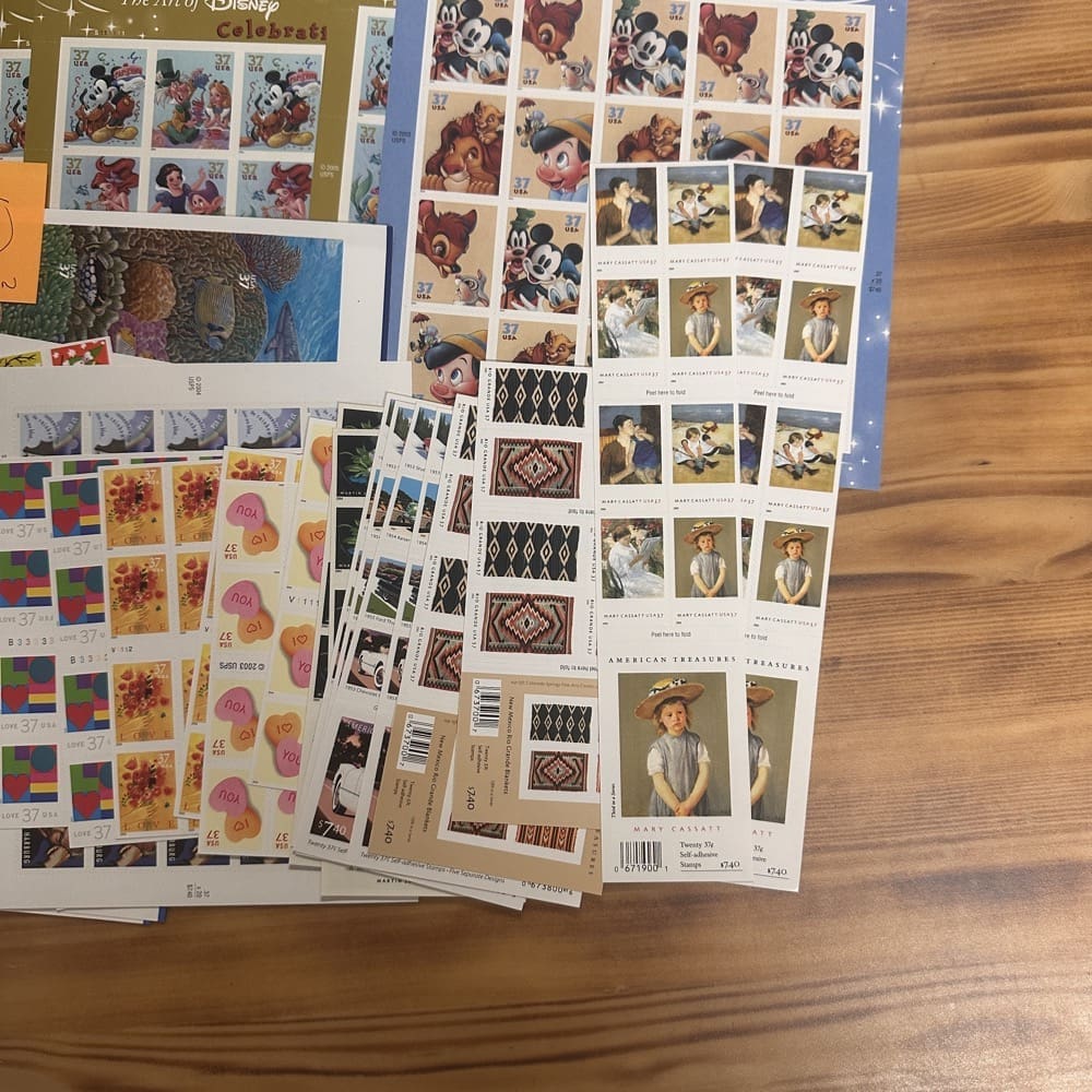 Lot of low-denomination postage stamps with values under the current First-Class rate.